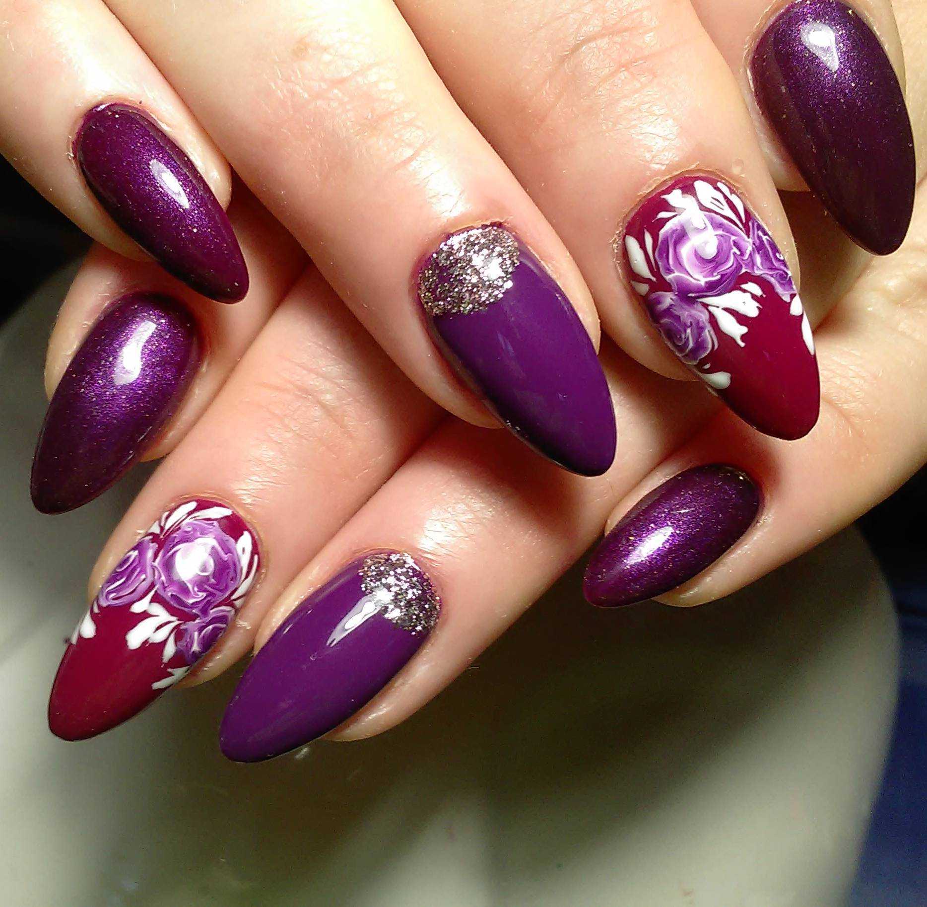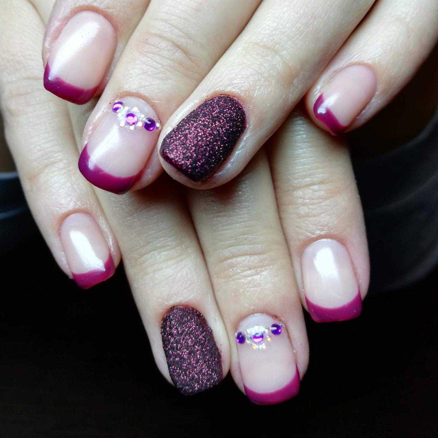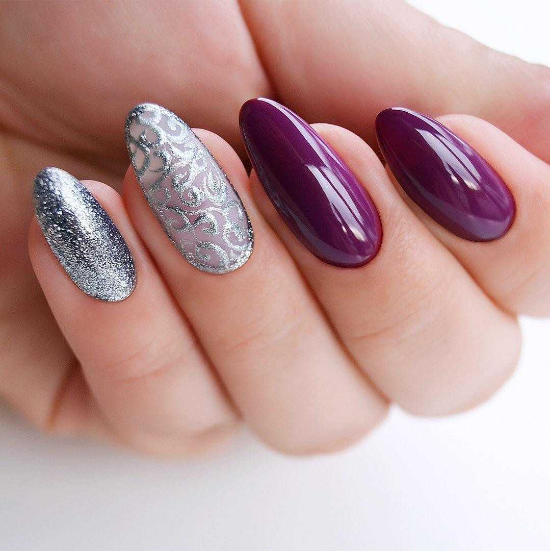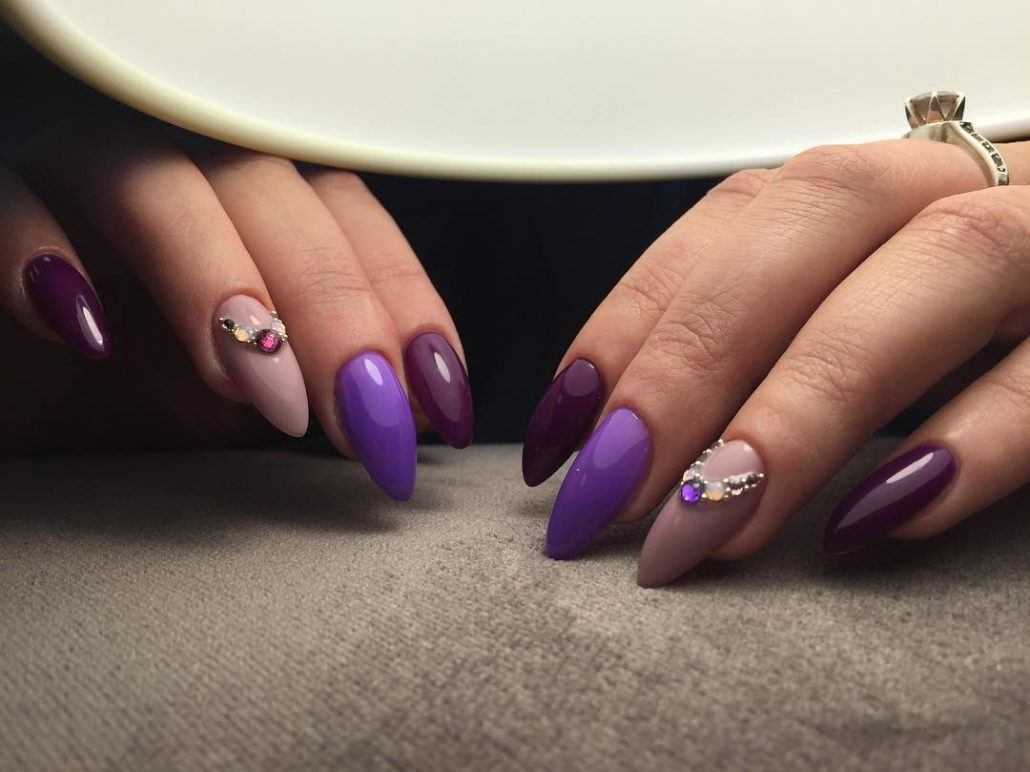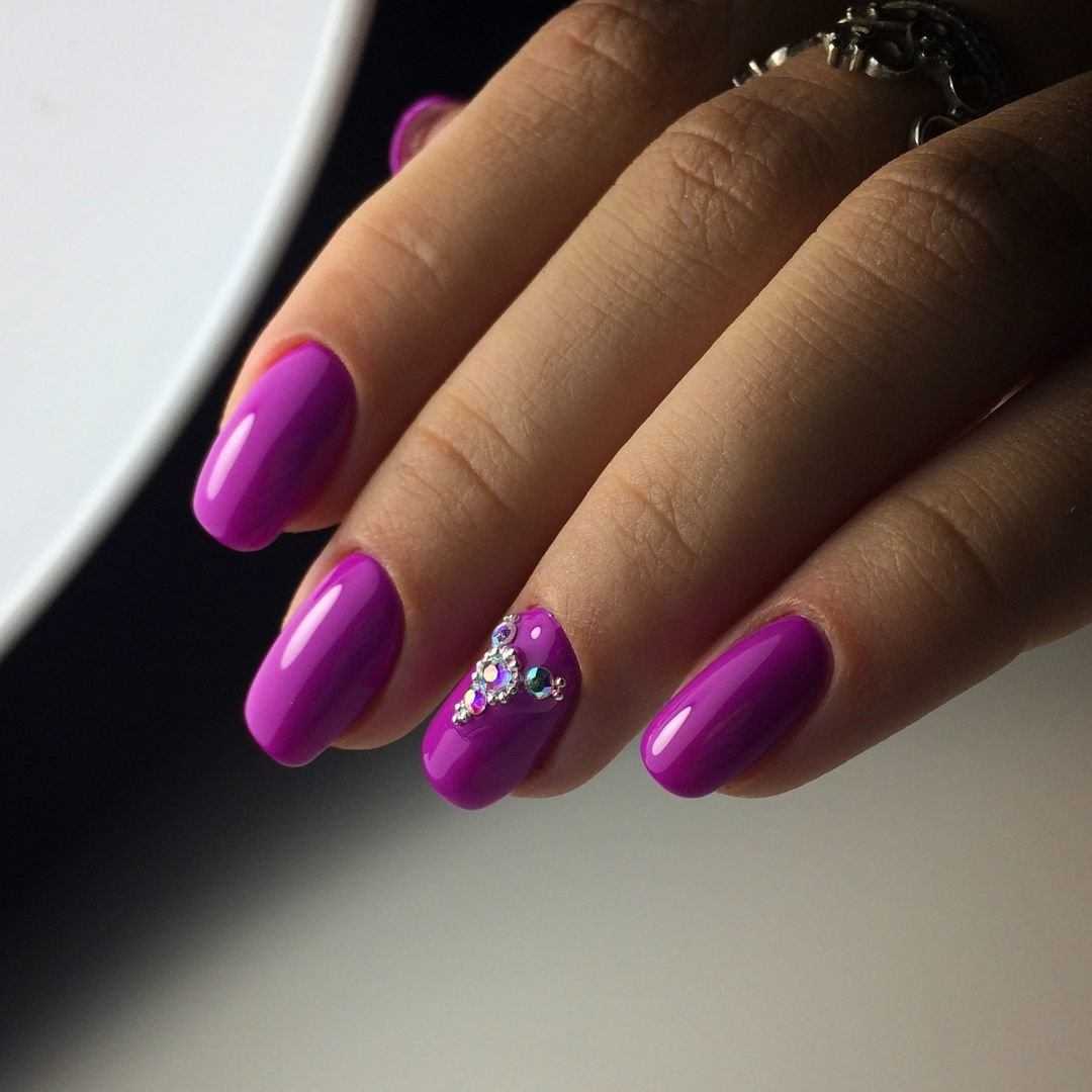 К малиновым оттенкам подходят насыщенные и темные тона сиреневого. Как правило, они используются для создания глянцевого маникюра и градиента. Украшают ногти обычно поталью, блестками и стразами для создания максимально яркого образа.