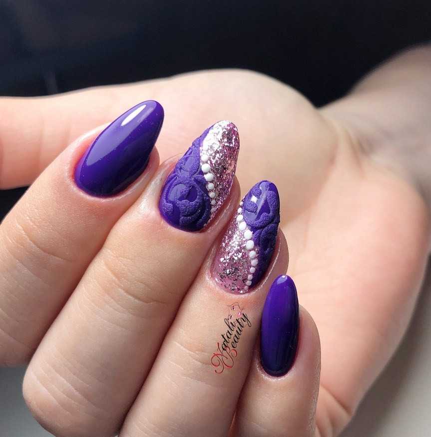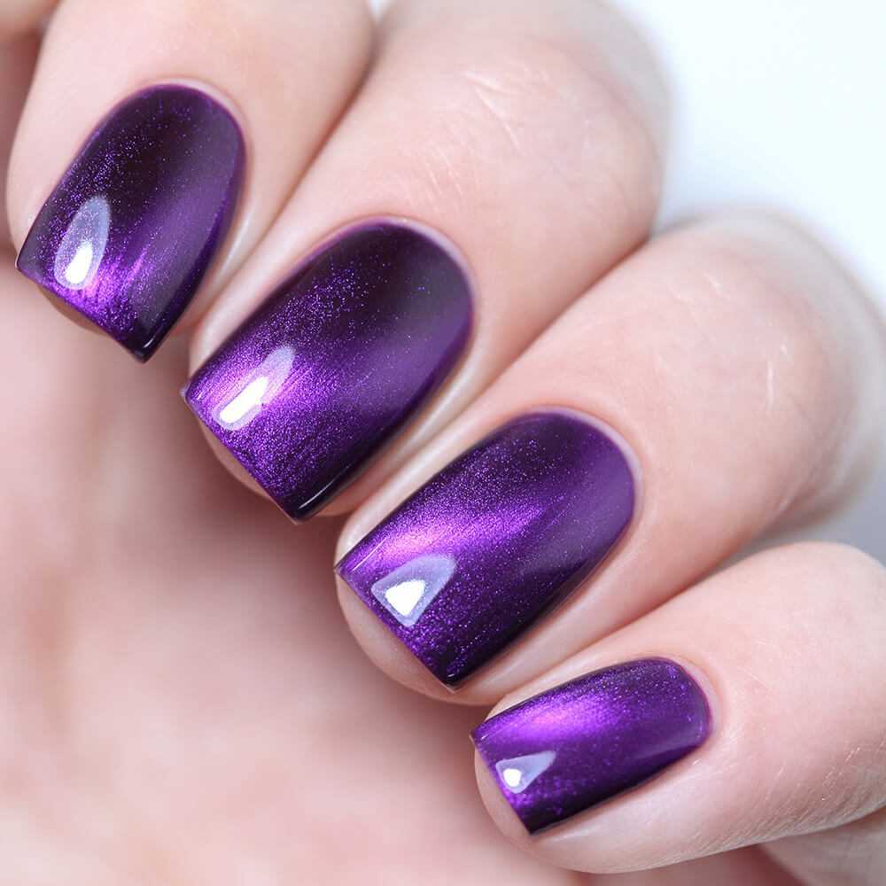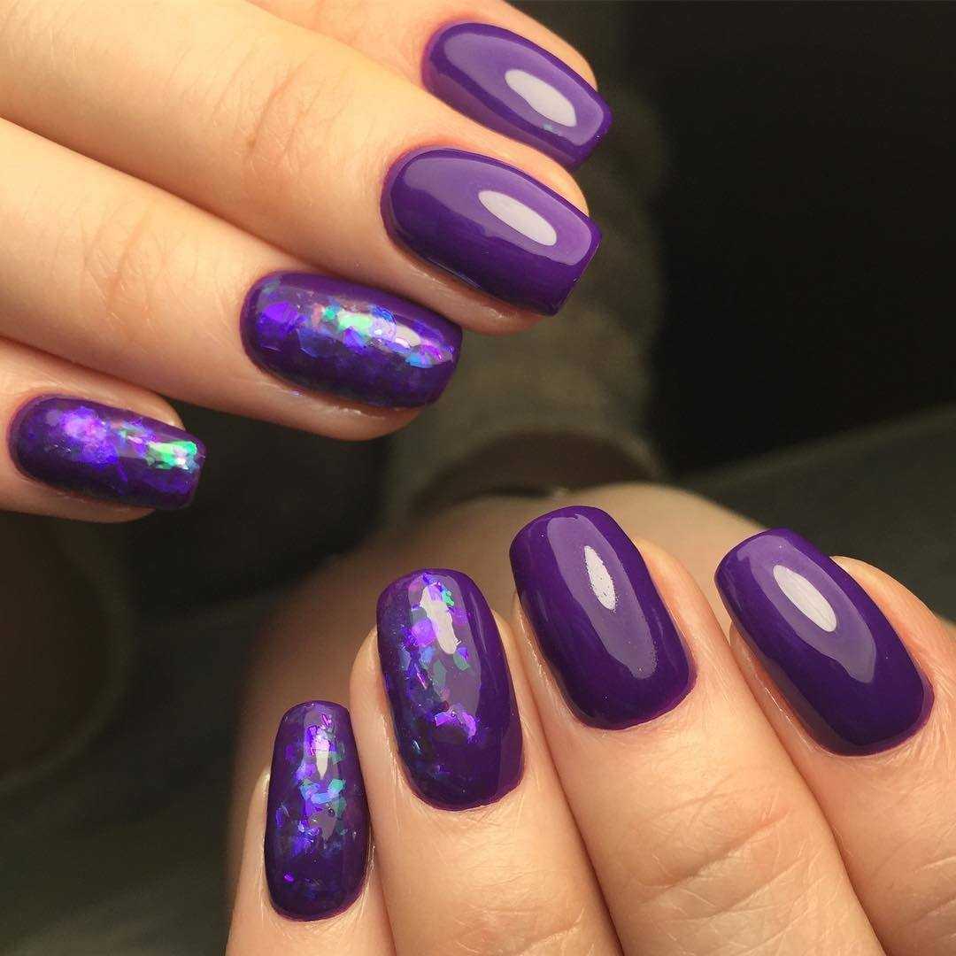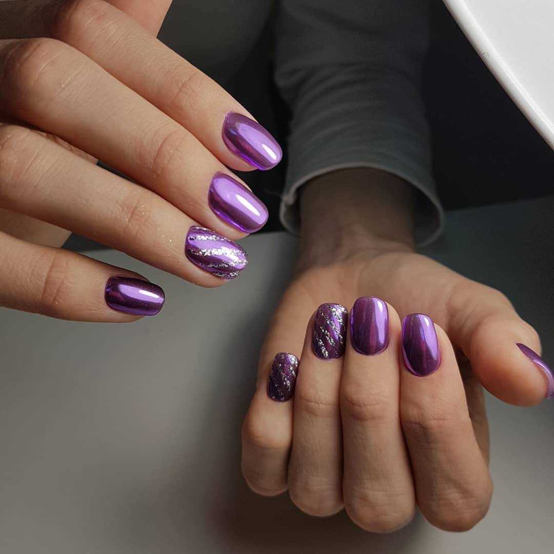 Модный фиолетовый маникюр 2021 – это не просто дизайн блестками, а использование для украшения светоотражающего гель-лака, который на свету становится очень выразительным.