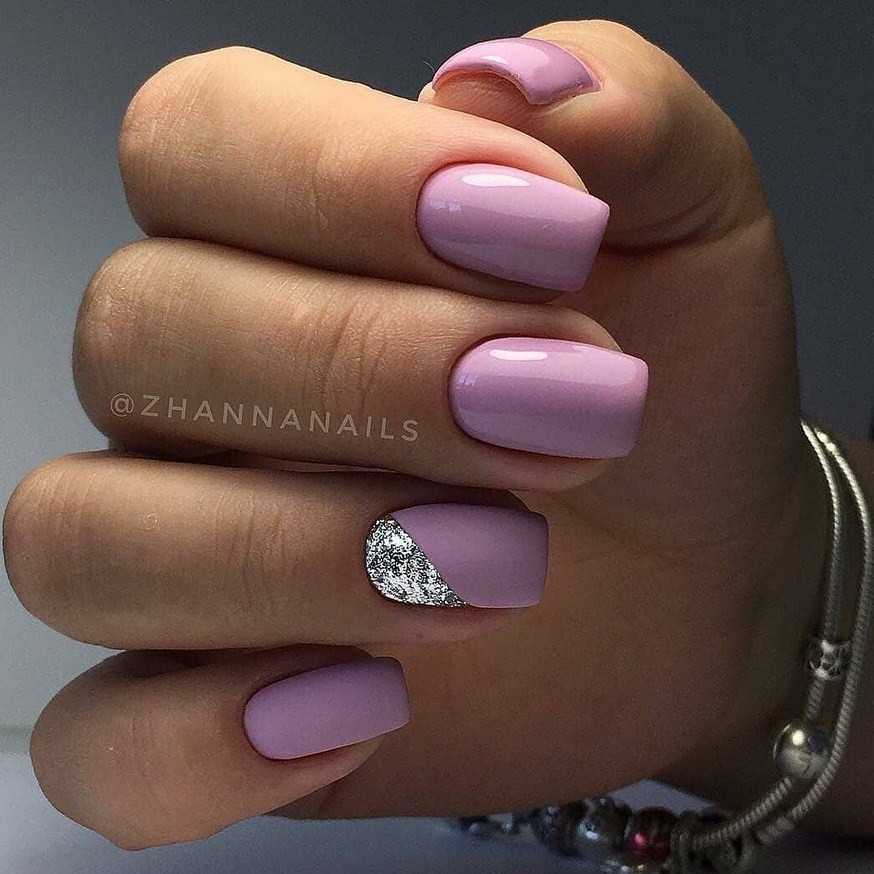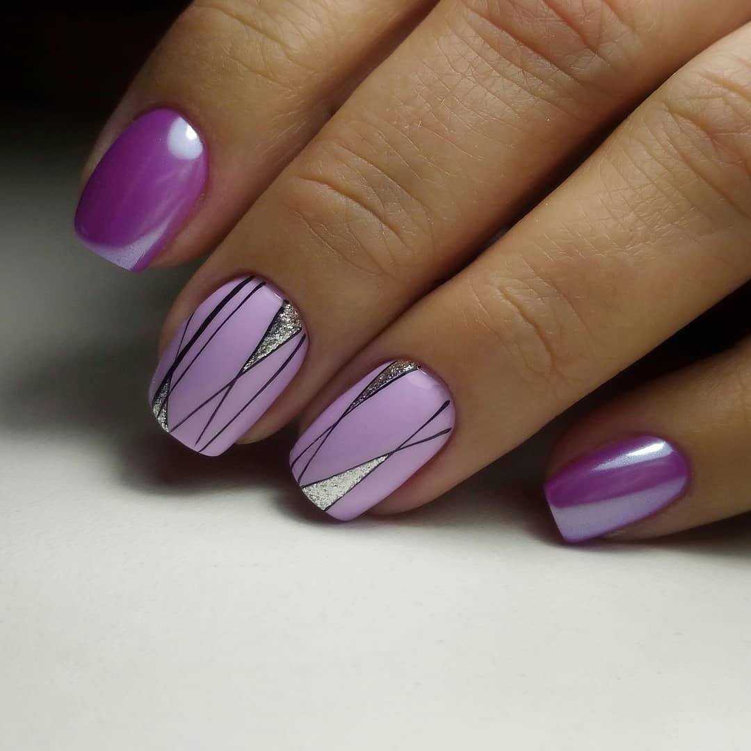 Сиреневый маникюр гармонирует с серыми тонами, особенно с серебристым. Чтобы создать подобную комбинацию, лучше всего использовать матовые лаки. Серебристый можно использовать в качестве декора: блесток, геометрического принта, полосок и фольги.