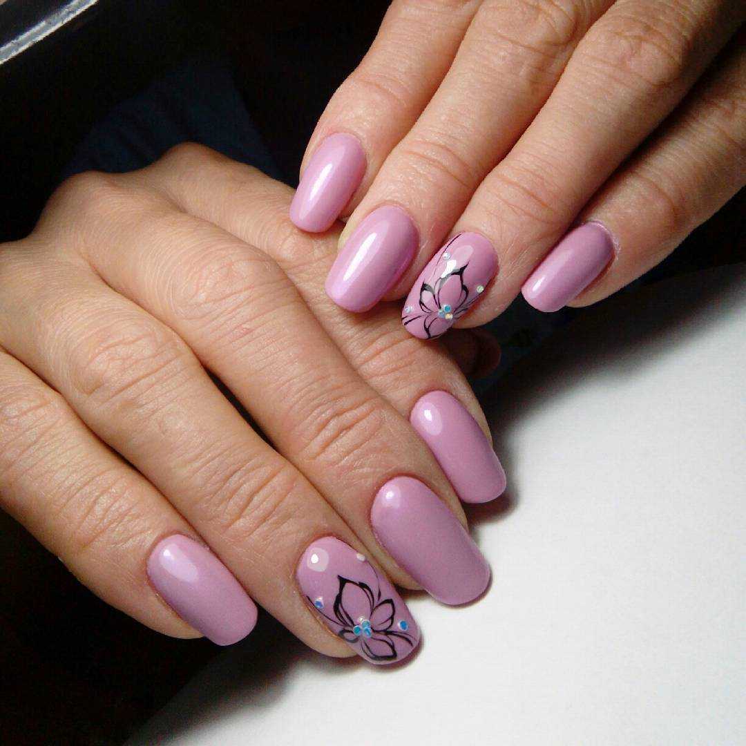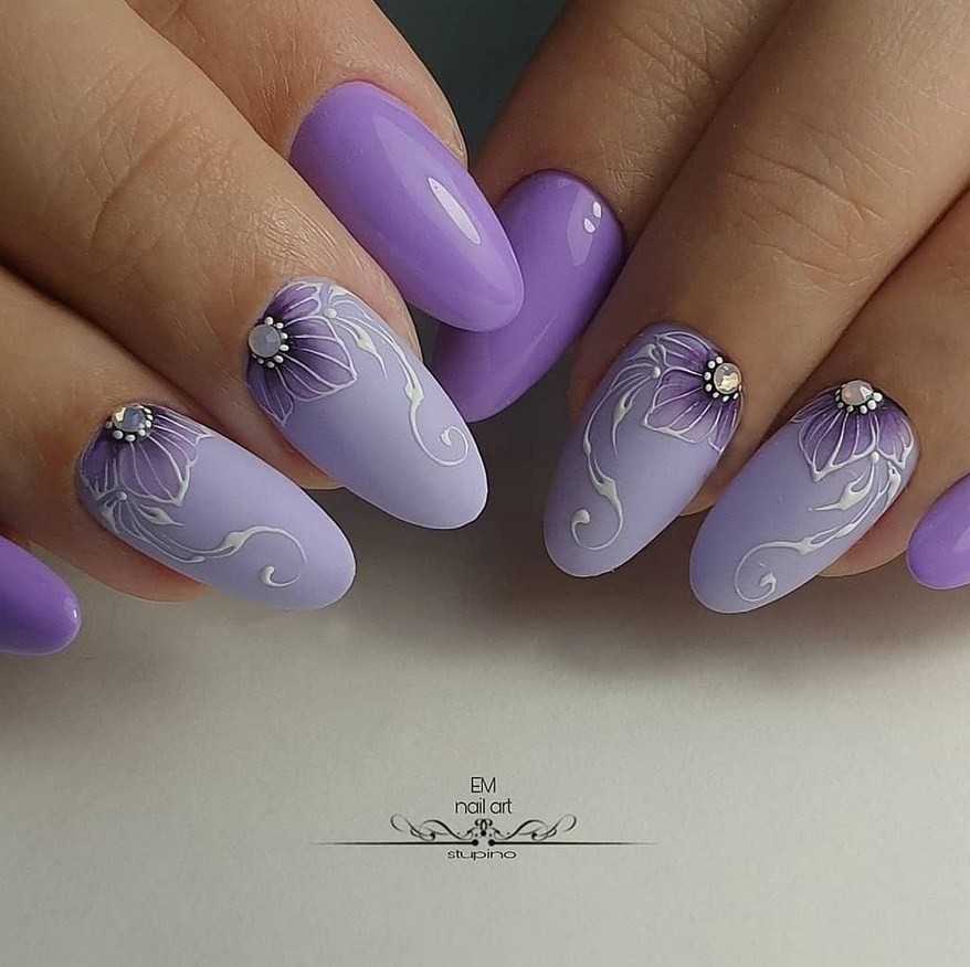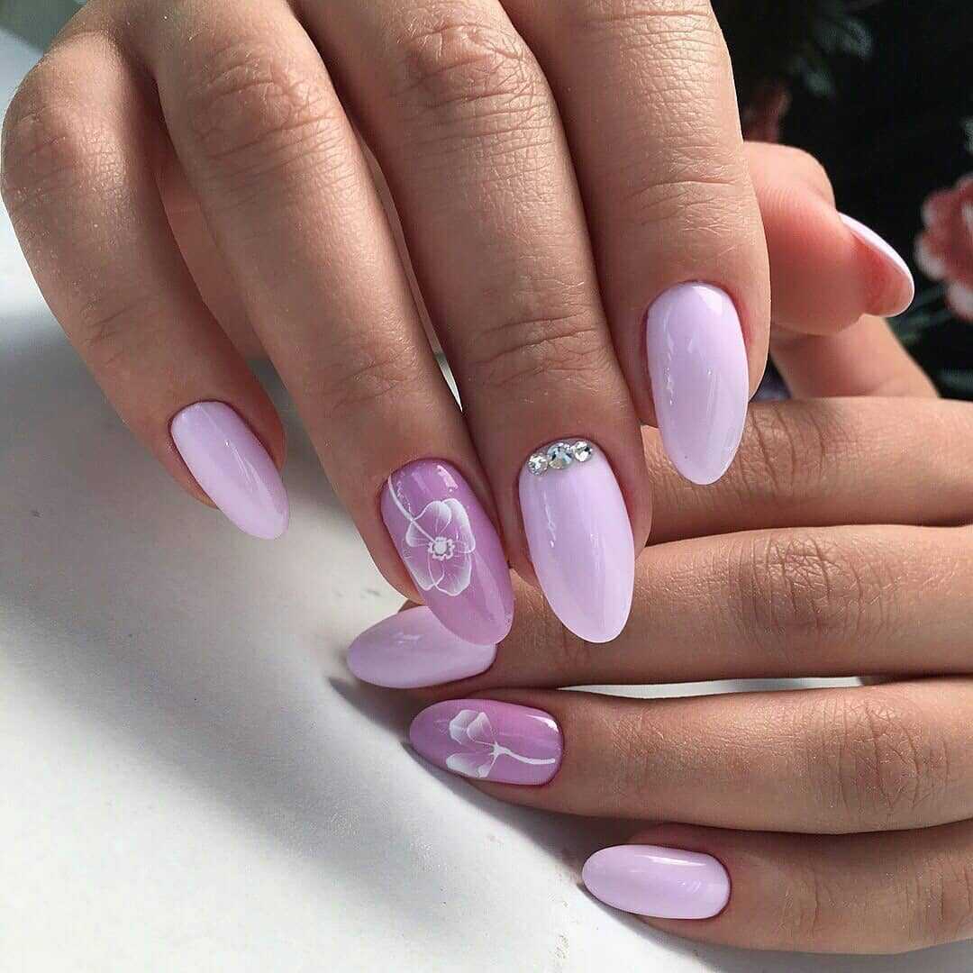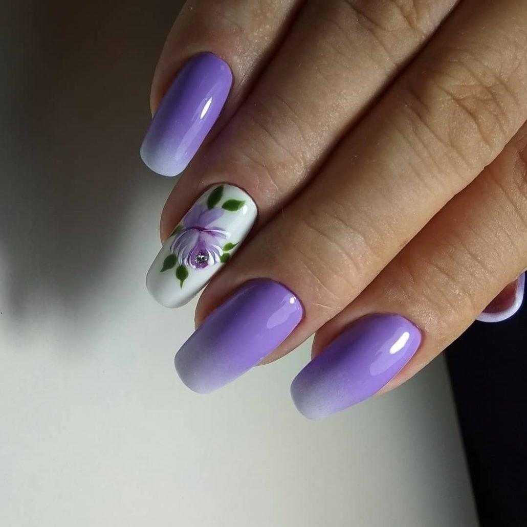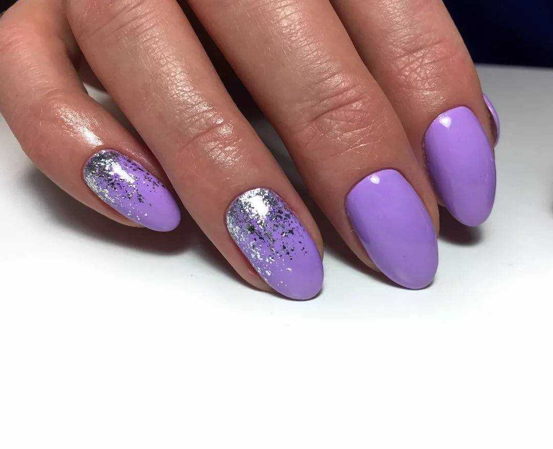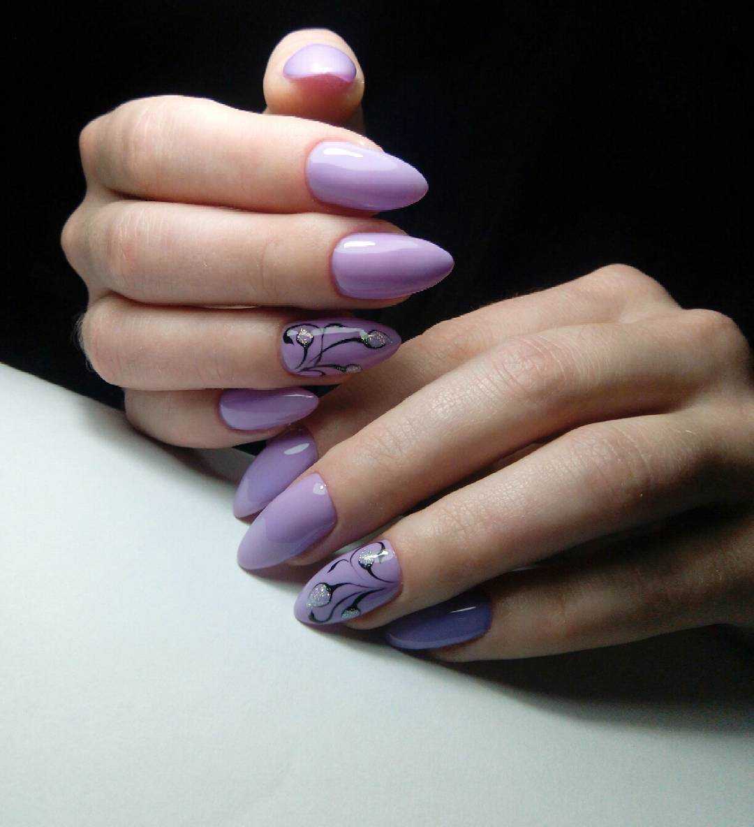 Для коротких ноготков овальной формы хорошо подойдёт однотонный дизайн. Не возбраняется его дополнение цветочками, минималистичными рисунками. На длинных ногтях лучше всего смотрится градиент в оттенках сирени.