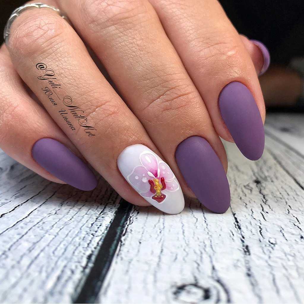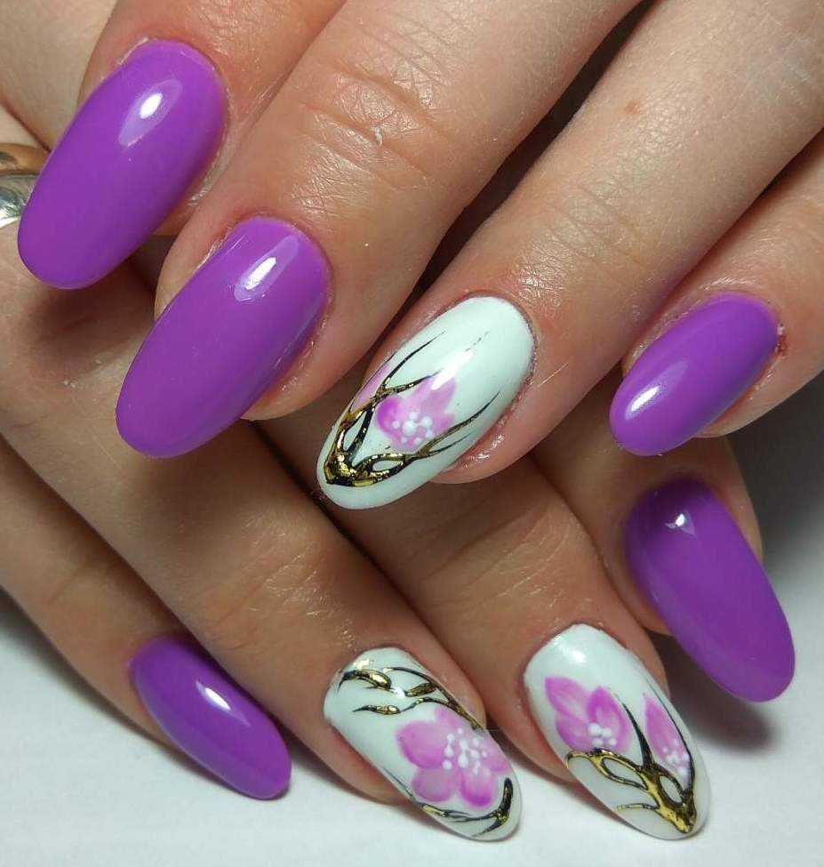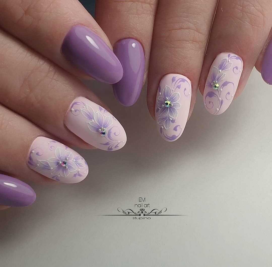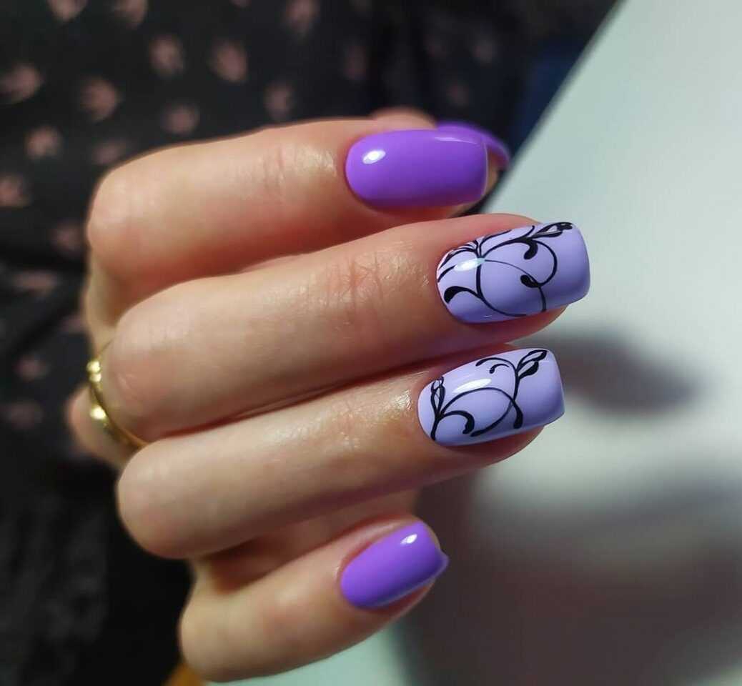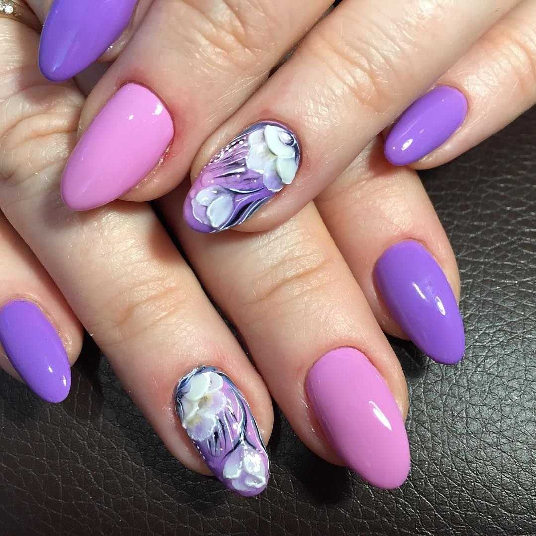 Для коротких ноготков овальной формы хорошо подойдёт однотонный дизайн. Не возбраняется его дополнение цветочками, минималистичными рисунками. На длинных ногтях лучше всего смотрится градиент в оттенках сирени.
