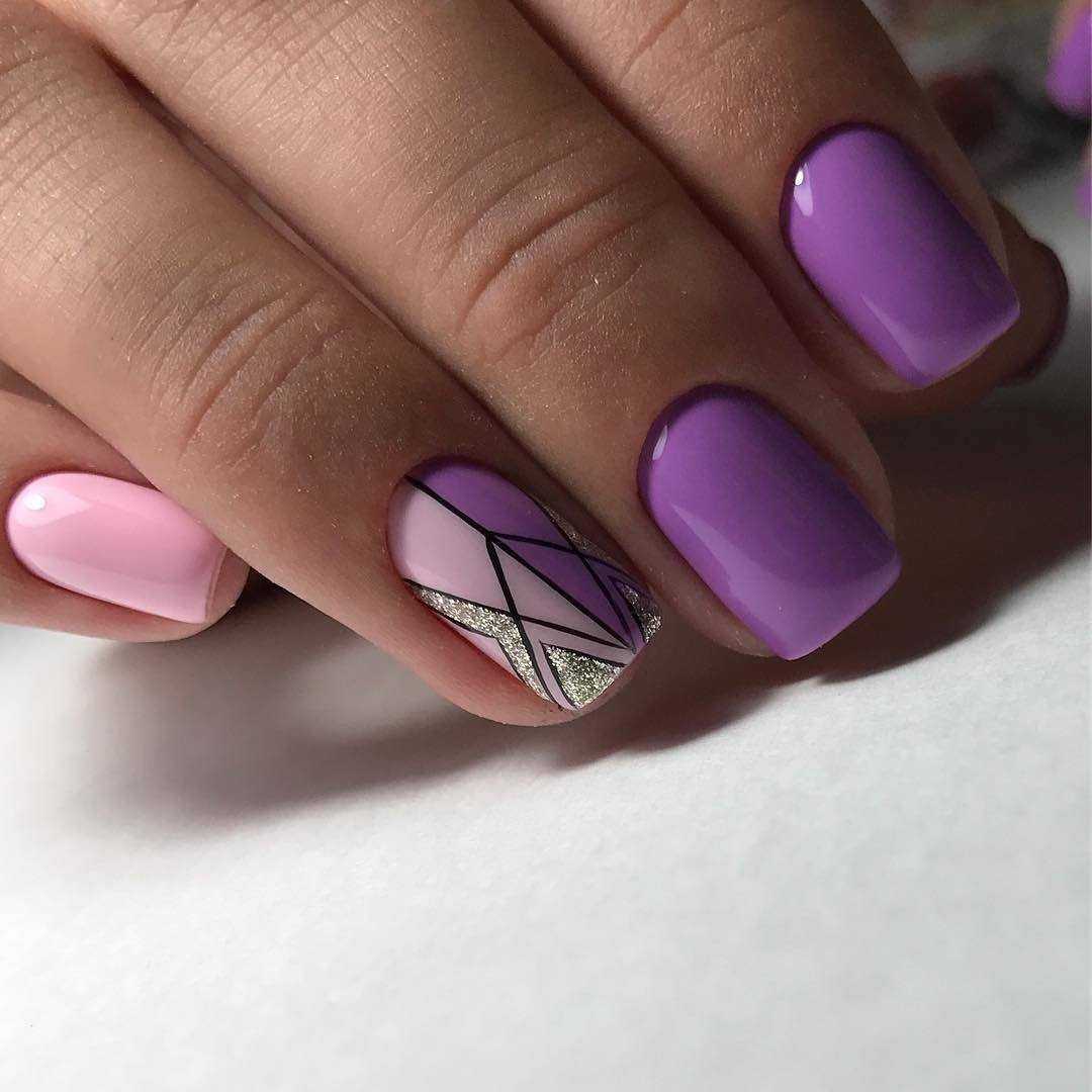 Сиреневый и лиловый являются родственными цветами и хорошо сочетаются друг с другом в рамках одного дизайна. Их применяют как в глянцевом, так и в матовом вариантах, дополняются блестками, цветочными или геометрическими принтами, фольгой. Цвета можно использовать для создания градиента.