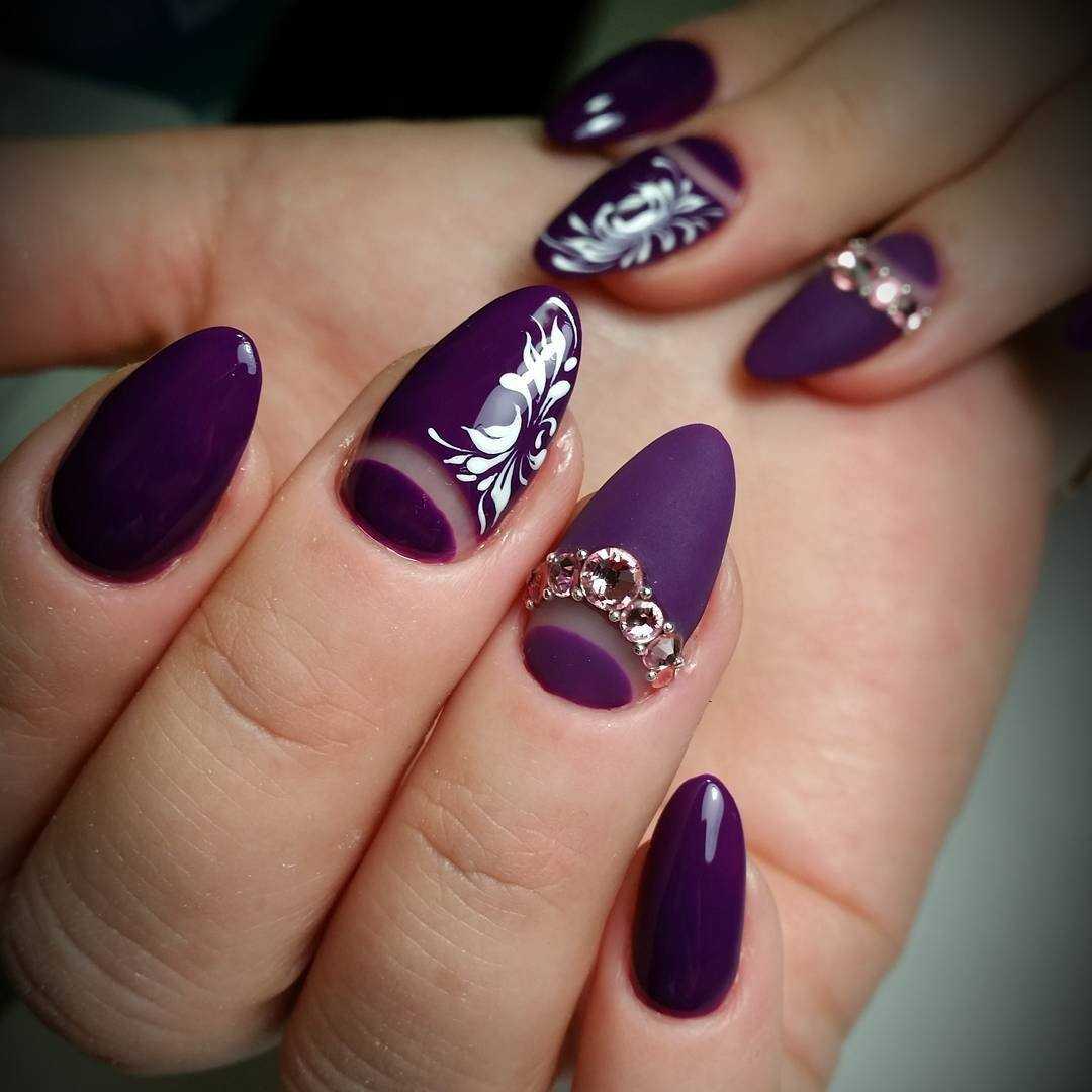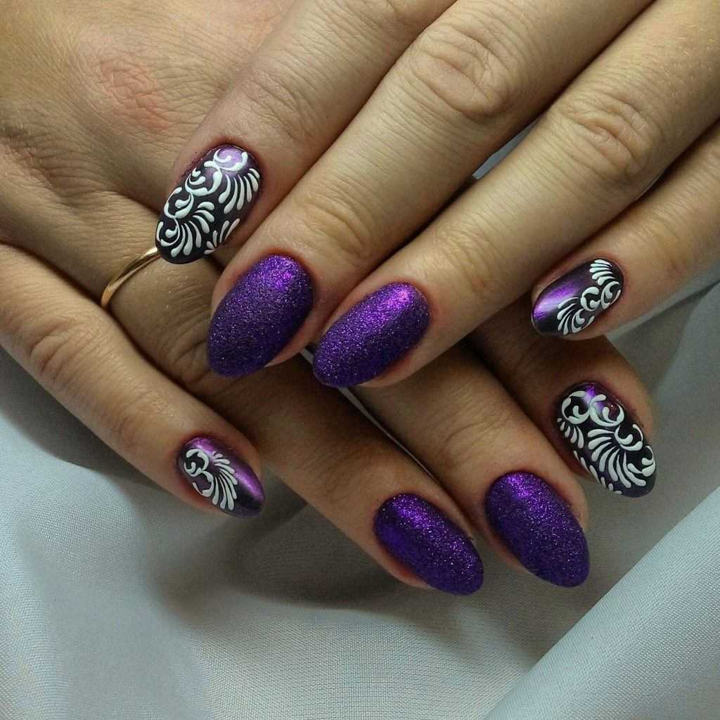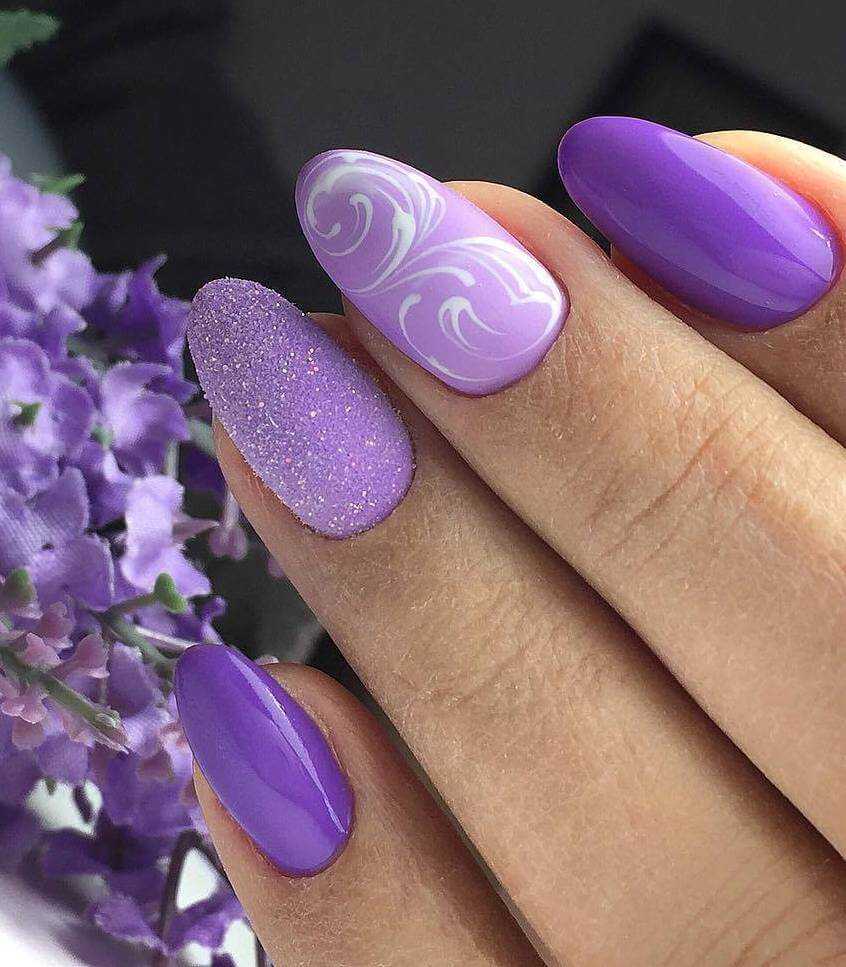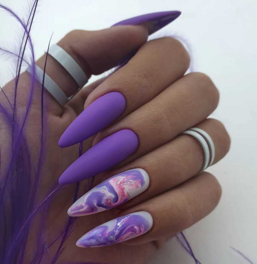 Фиолетовый маникюр на миндаль или стилеты – с абстрактными рисунками на слегка блестящем фоне.