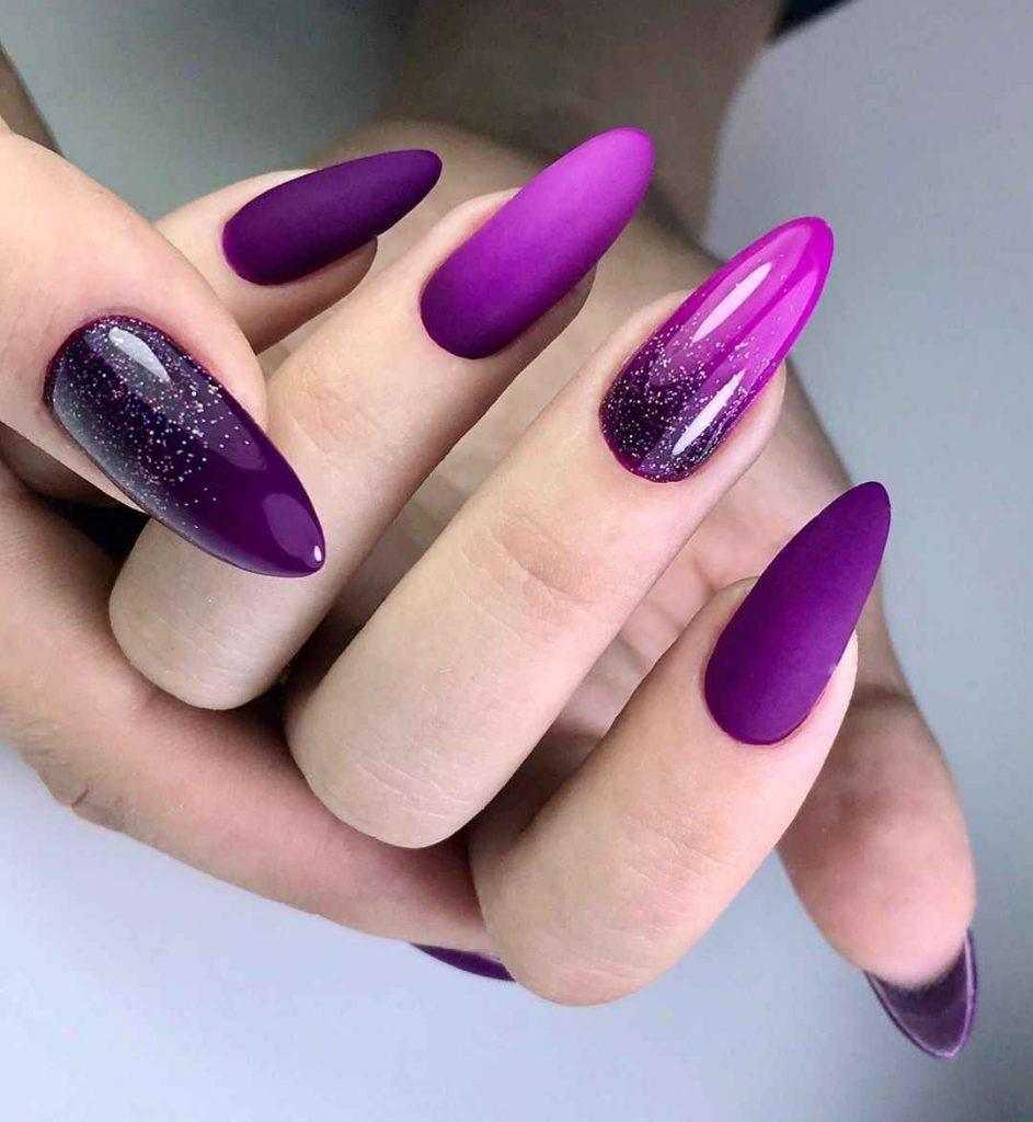 Глянцевый или матовый? Этот вопрос задаёт себе каждая модница, выбирая финальный слой, от которого полностью будет зависеть внешний облик вашего маникюра. Глянец всегда выглядит дорого и уникально скрывает небольшие недочёты в покрытии. Однако для подчёркивания уникальности различных техник дизайнеры единогласно рекомендуют в этом сезоне бархатистое матовое покрытие. Применение этой техники усилит эффект плавного или резкого перехода между оттенками фиолетового и сделает акцент на высоком качестве исполнения дизайна. Модной идеей стало покрытие одного или двух оттенков в такой технике. Если вы решили сделать матовыми все ногти, добавьте в дизайн стразы, втирку или элементы фольги. Это сбалансирует композицию и добавит нотку дороговизны в ваш образ.