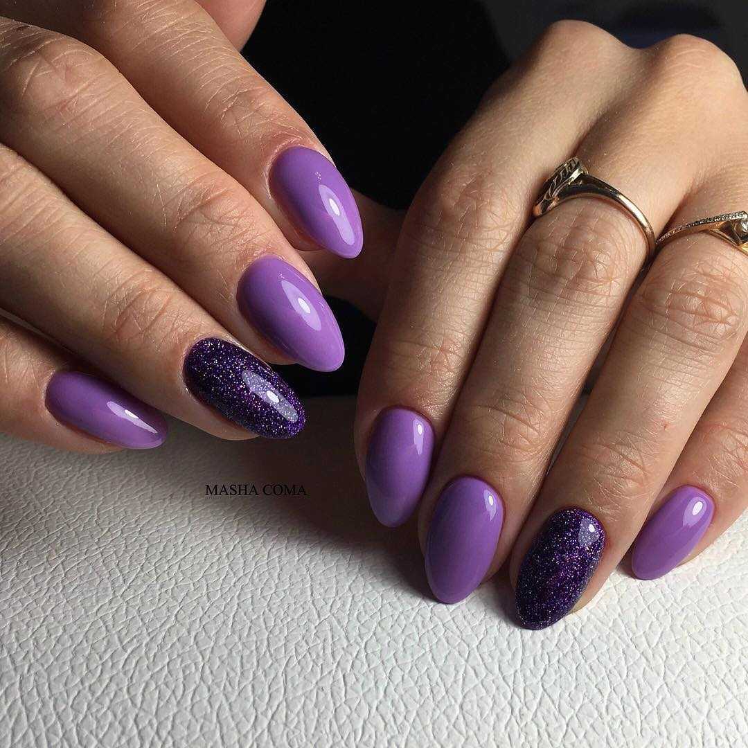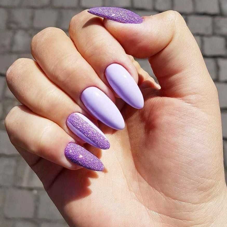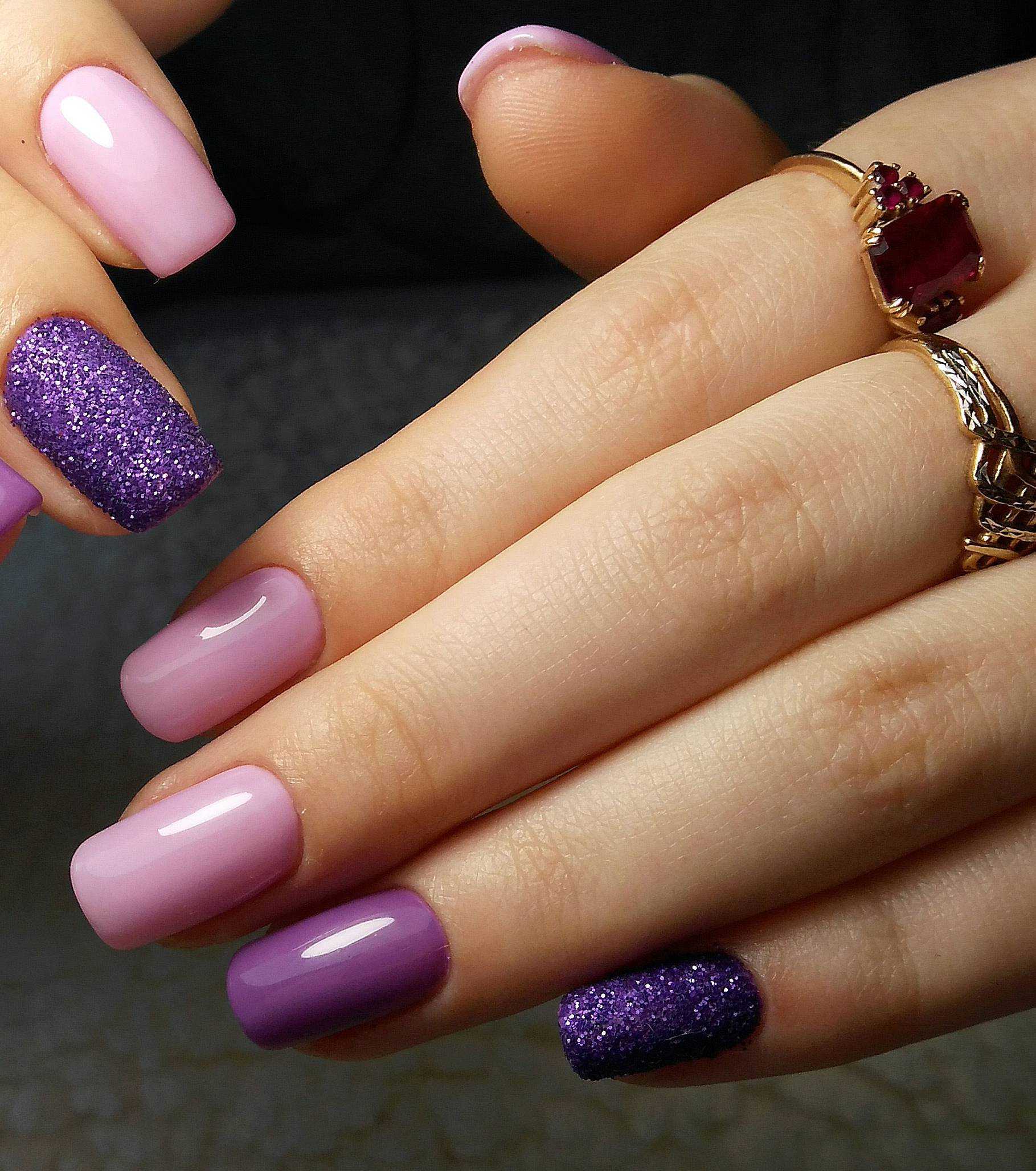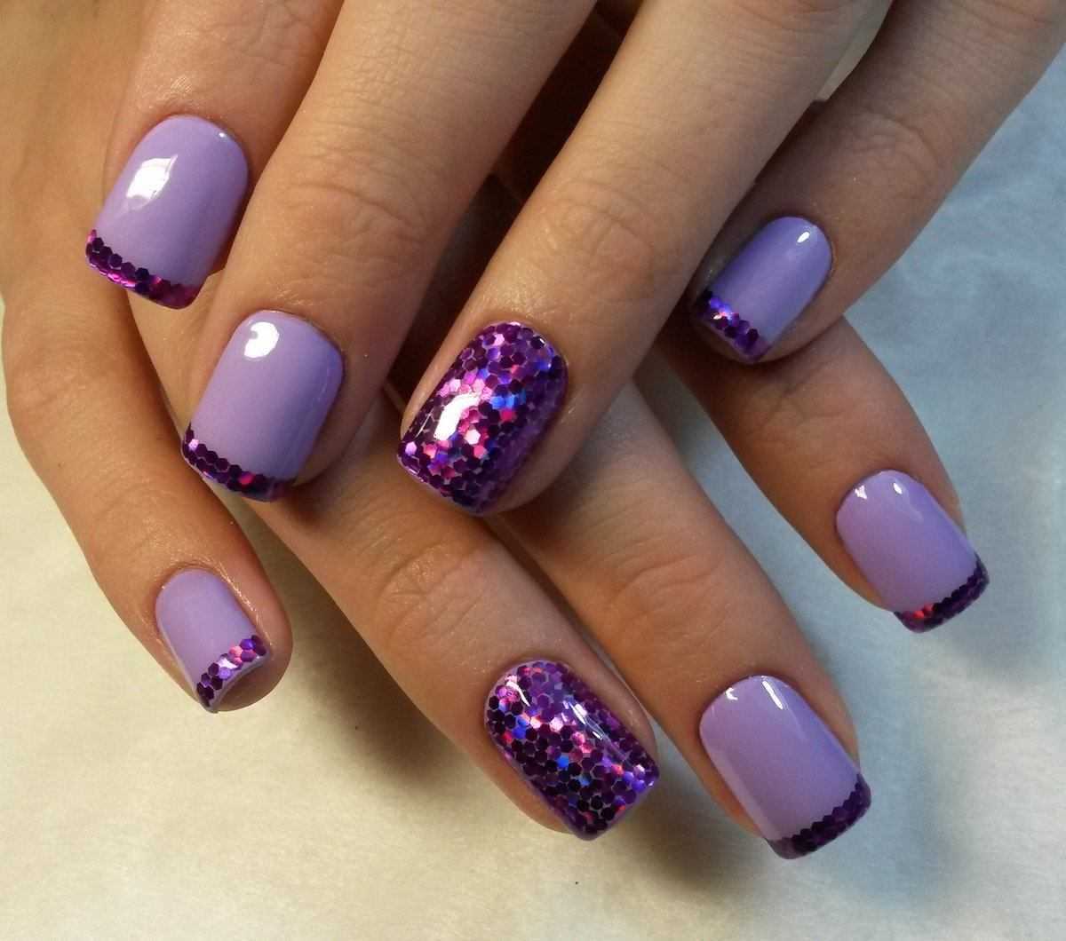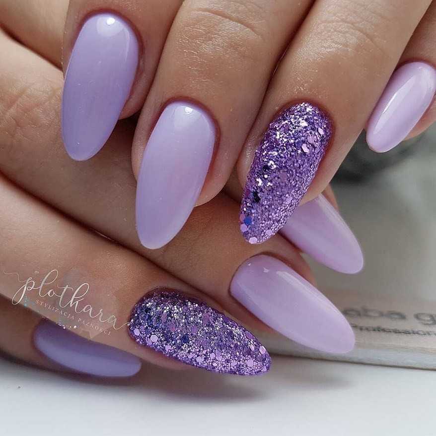Очень элегантный дизайн ногтей, в котором глиттер сочетается с сиреневым гель-лаком. Таким образом, они не привлекают к себе и дизайну слишком много внимания. Также используйте более яркие акценты: серебряные, золотые, розовые блестки и другие блестящие украшения.