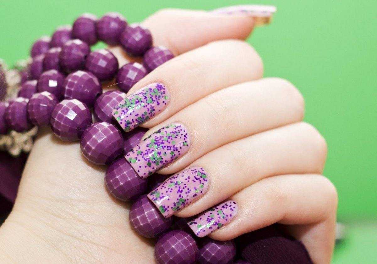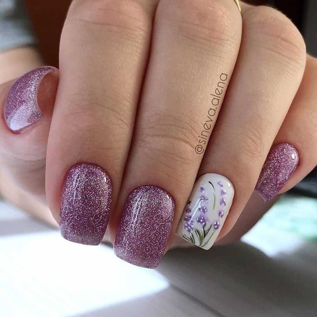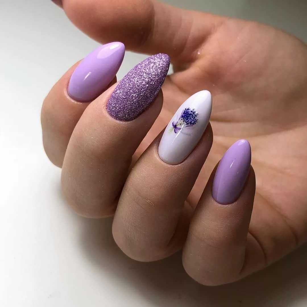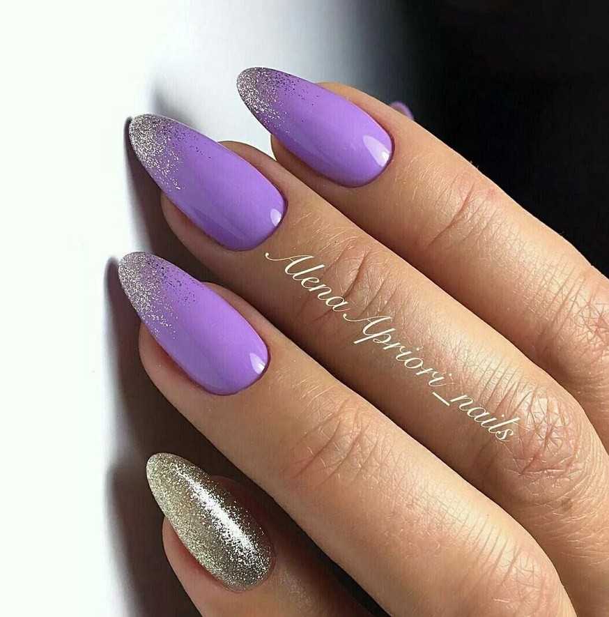 Очень элегантный дизайн ногтей, в котором глиттер сочетается с сиреневым гель-лаком. Таким образом, они не привлекают к себе и дизайну слишком много внимания. Также используйте более яркие акценты: серебряные, золотые, розовые блестки и другие блестящие украшения.