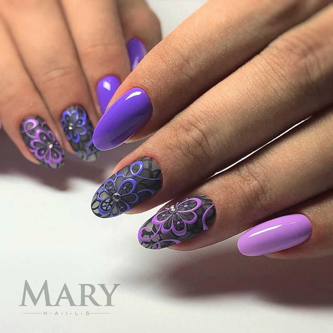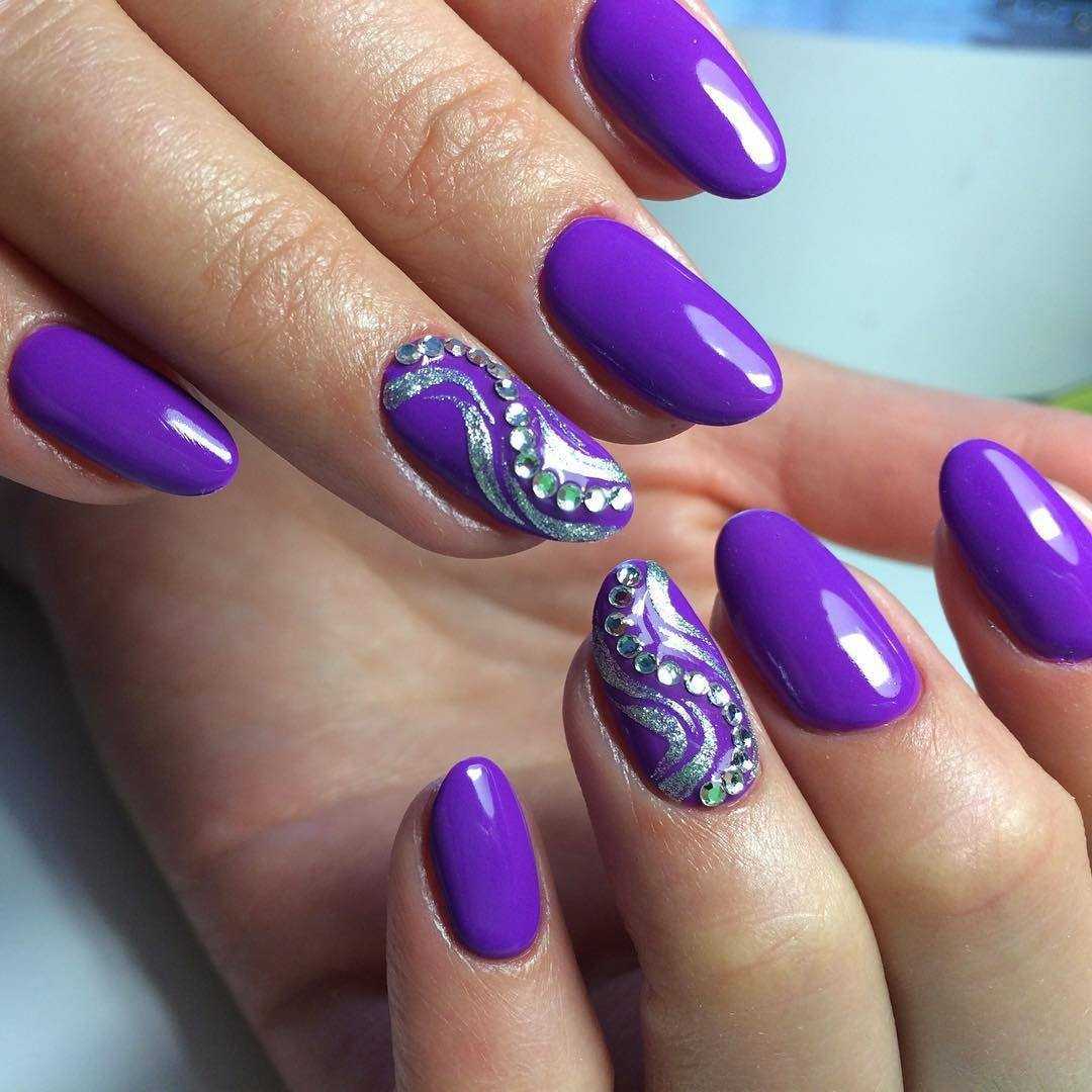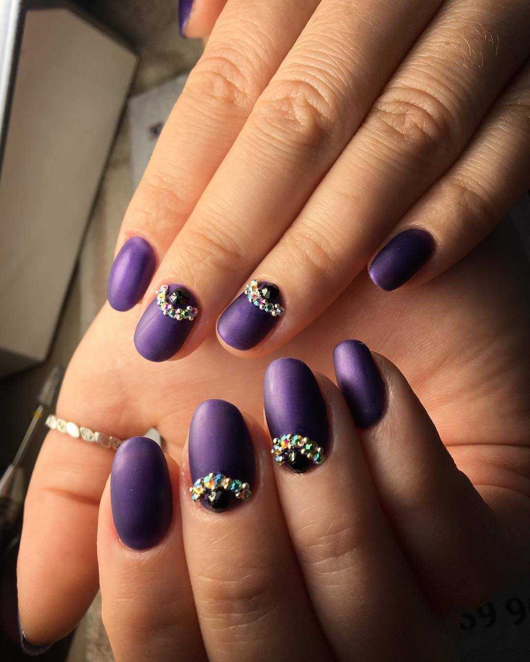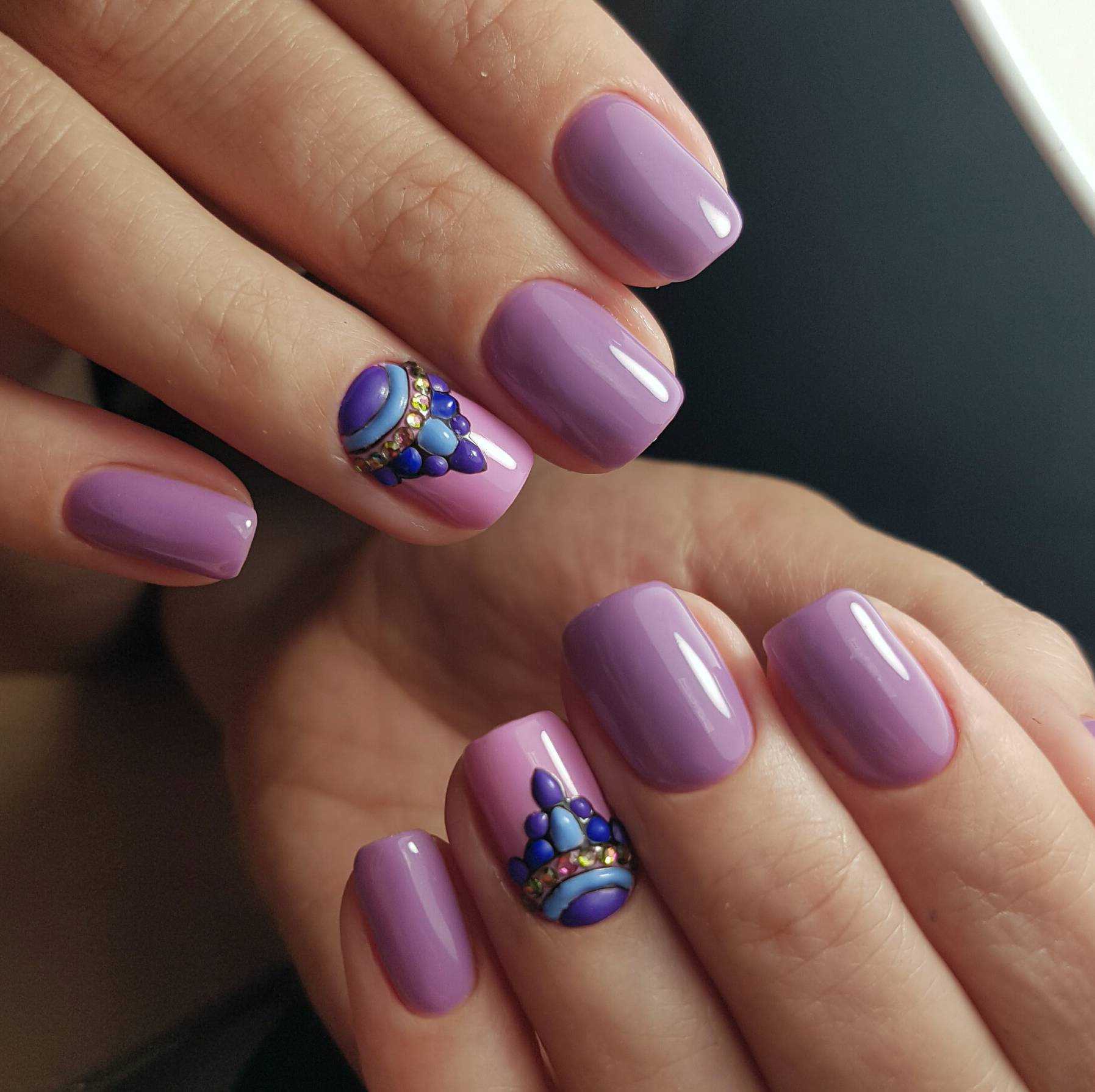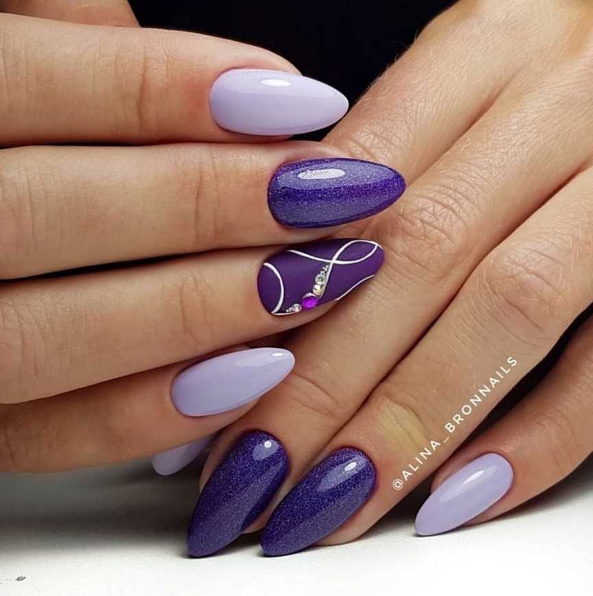 Поэкспериментируй с оттенками. Лавандовый, сиреневый и баклажановый, дополненные паутинкой из линий и стразами – идея для любого случая.