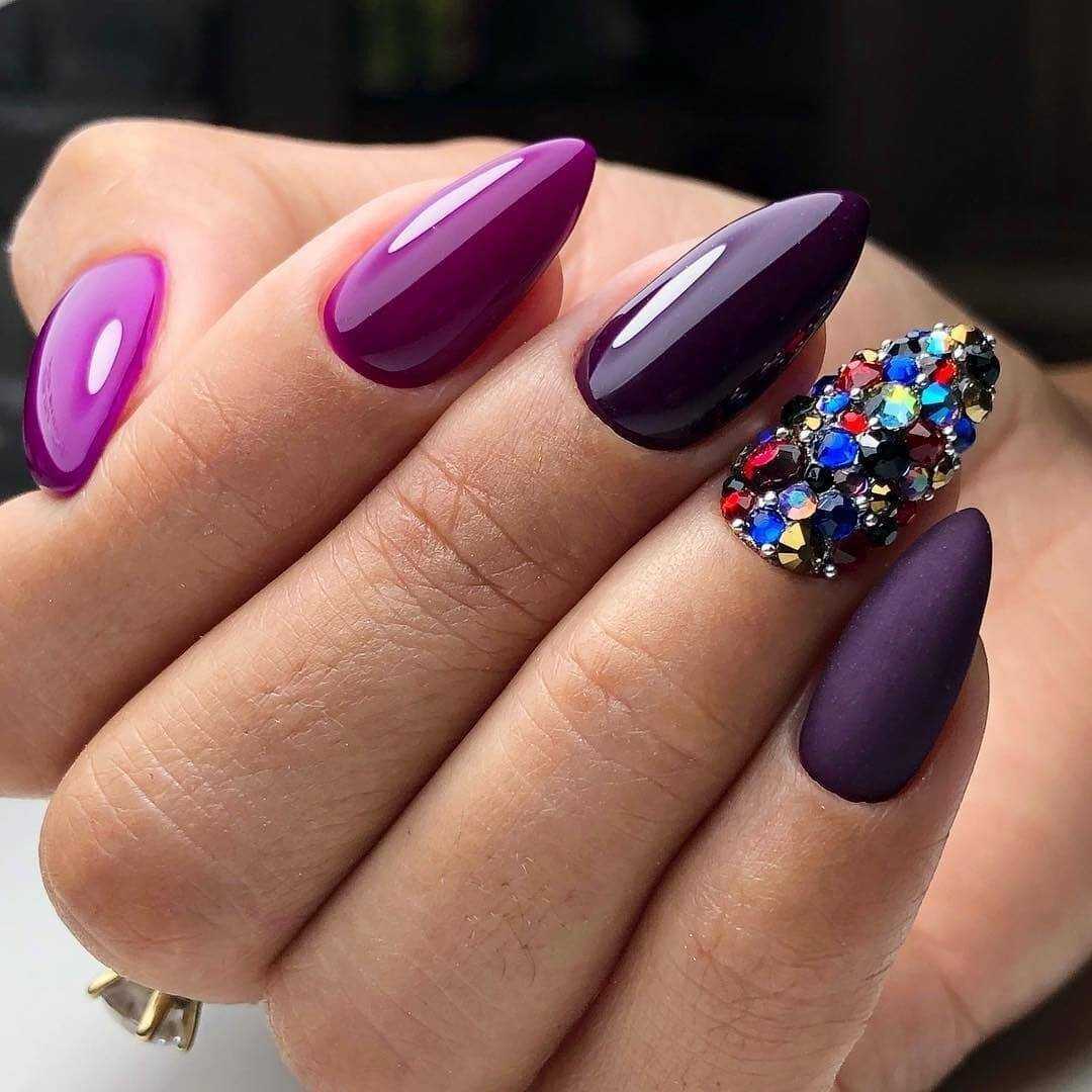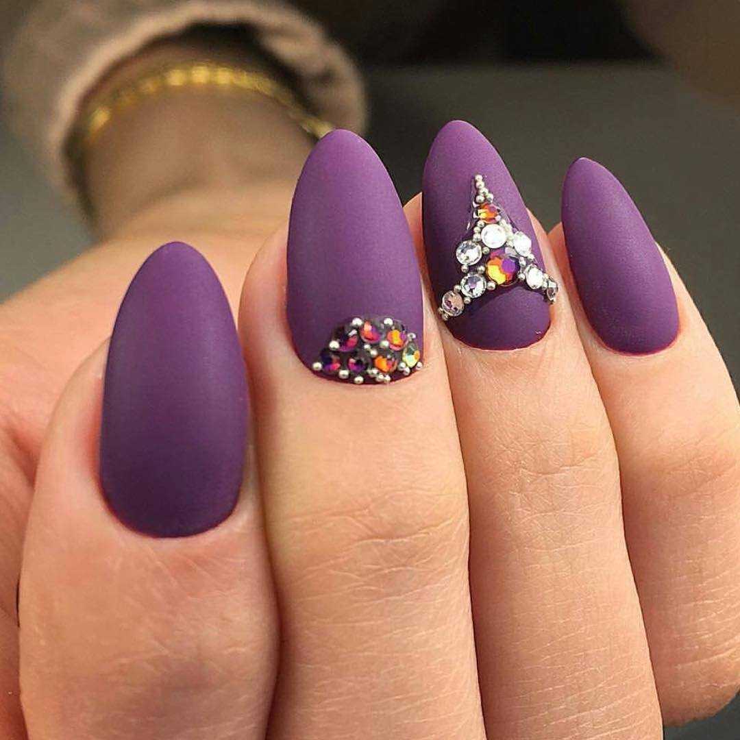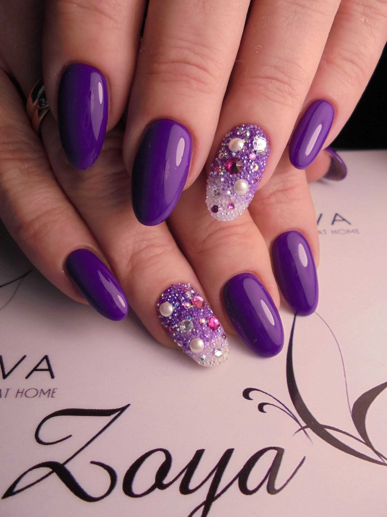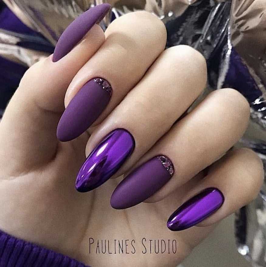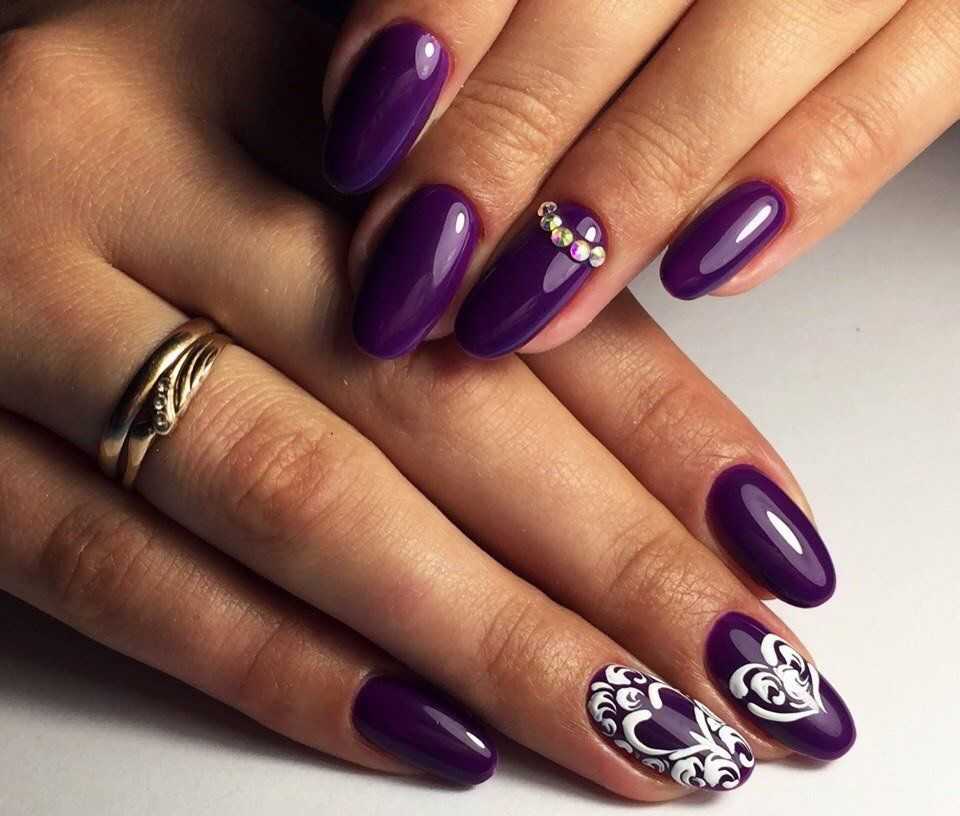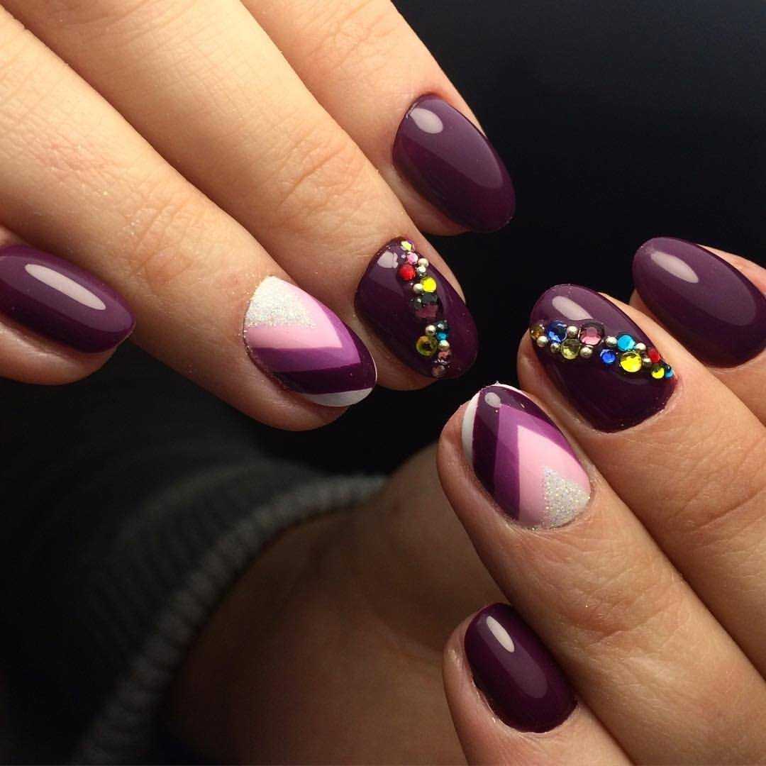 Поэкспериментируй с оттенками. Лавандовый, сиреневый и баклажановый, дополненные паутинкой из линий и стразами – идея для любого случая.
