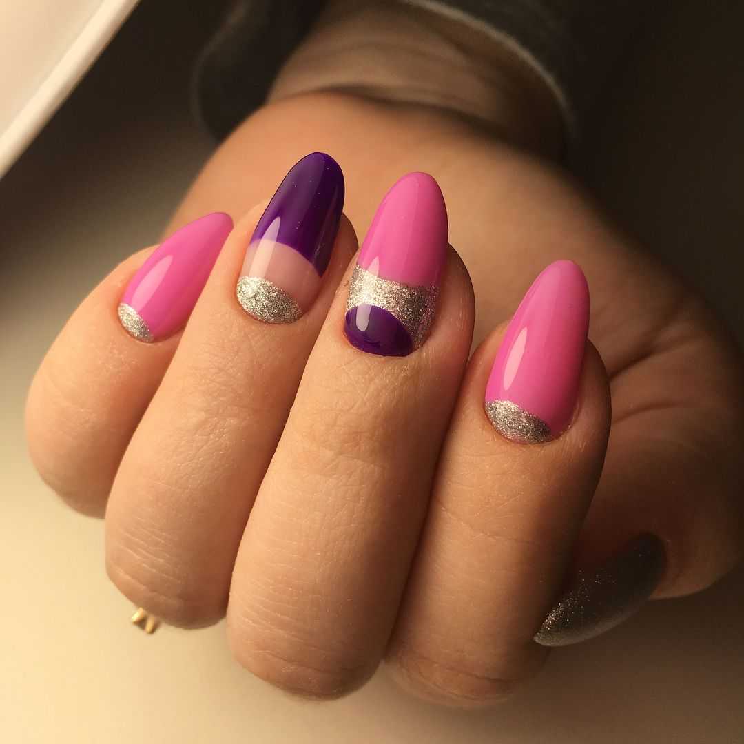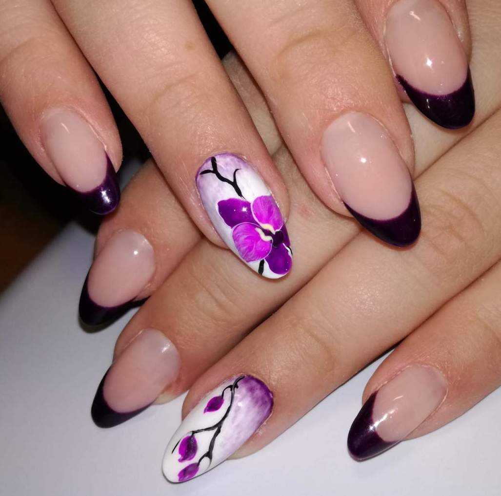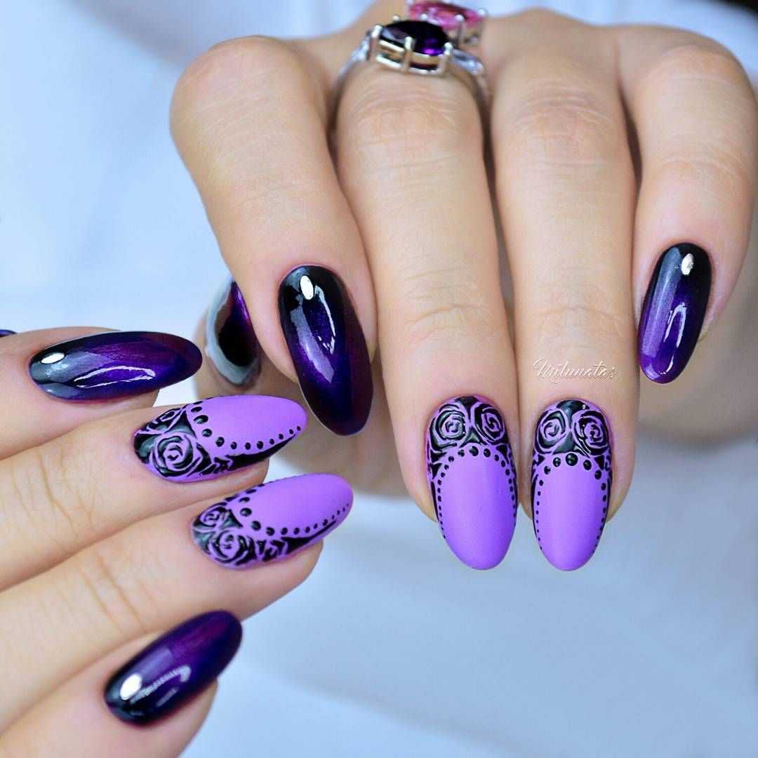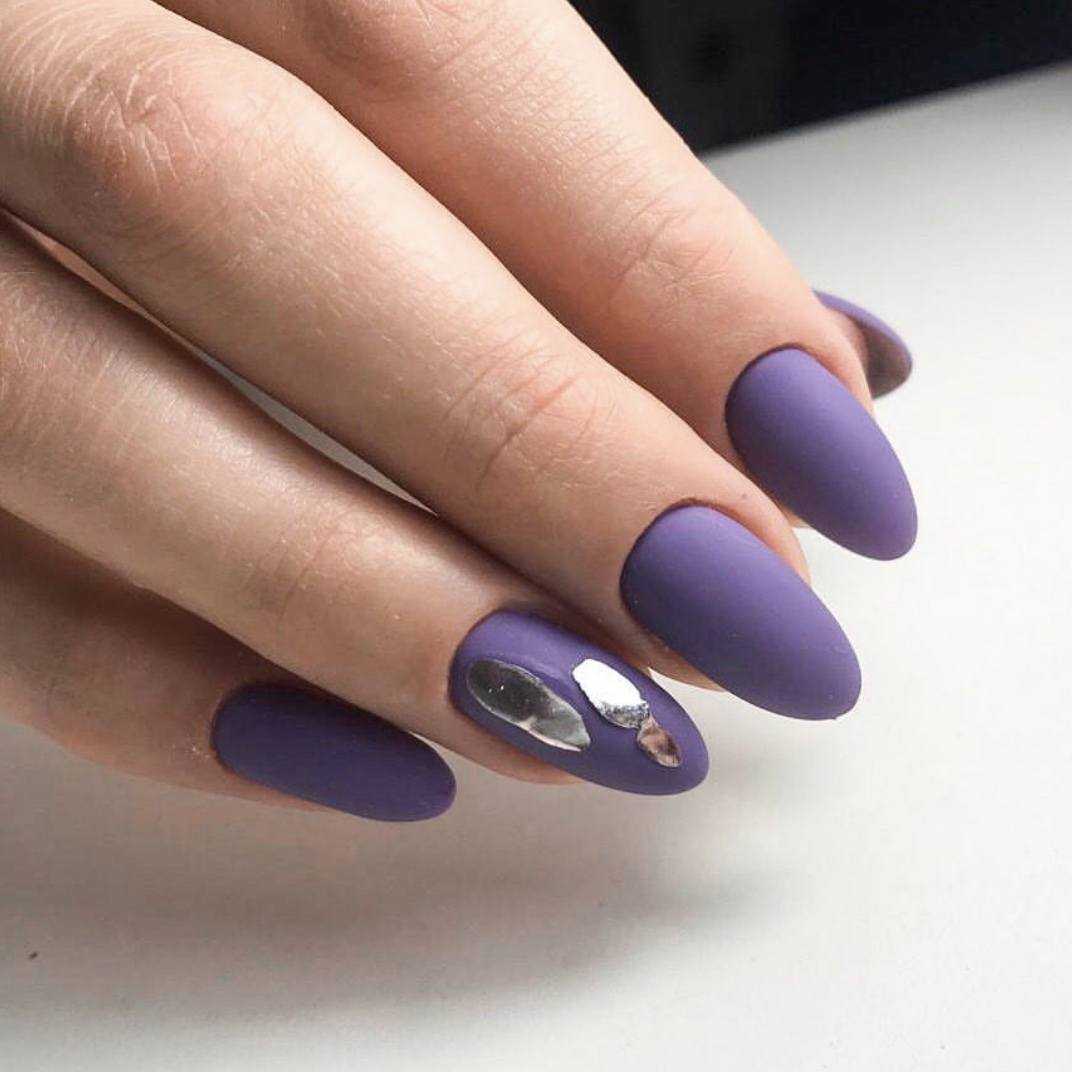 Форма миндаль – неизменная классика маникюра. Она отлично сочетается с любым оттенком из фиолетовой палитры – от пастельного до почти чёрного. Особенно эффектные варианты нейл-арта – кошачий глаз, омбре, френч.