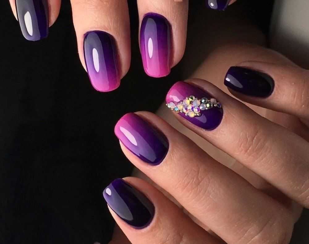 Сиреневый как один из вариантов фиолетового хорошо сочетается с его более темными тонами. Особенно хорошо маникюр выглядит в виде градиента – в рамках каждой отдельной пластины или путем последовательного окрашивания ногтей в разные оттенки. Сиренево-фиолетовый дизайн дополняют блестками и стразами.