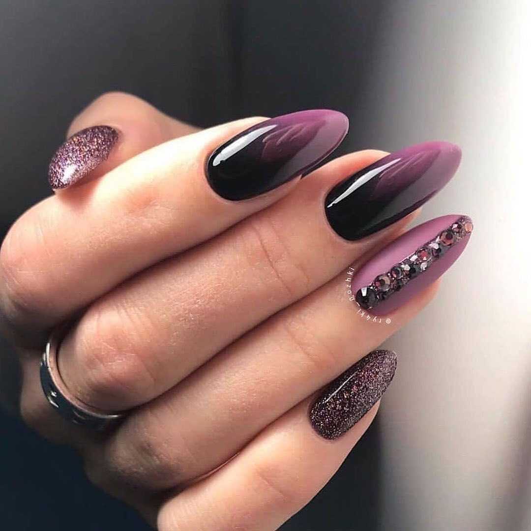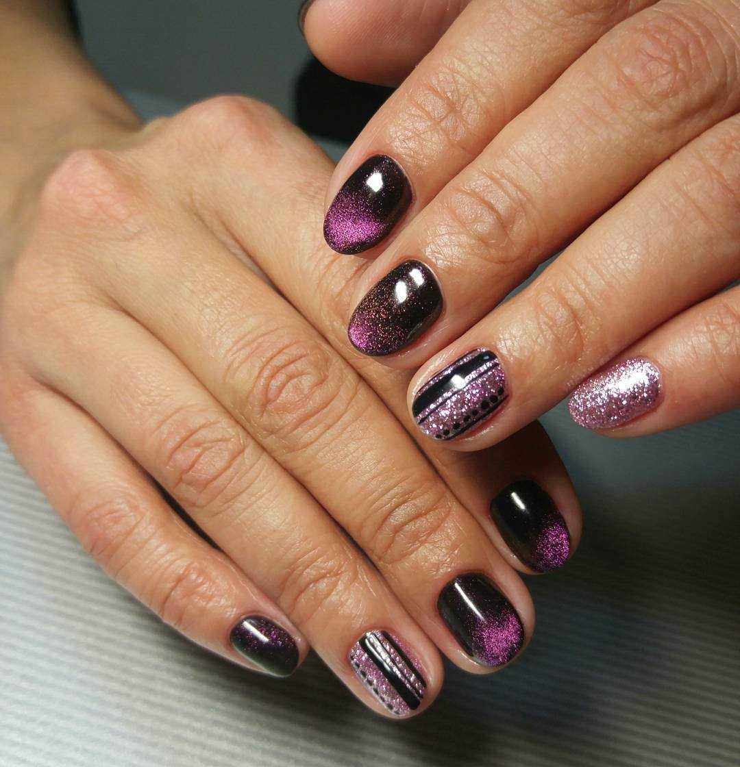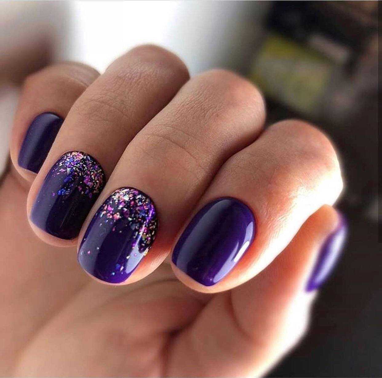 Темно-фиолетовый маникюр, разбавленный глиттером в тон, подойдет и для торжества, и для офиса.