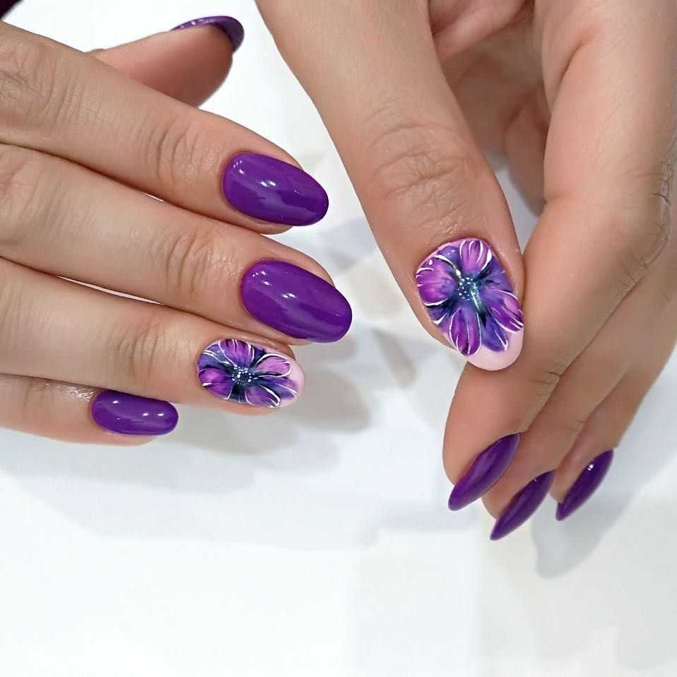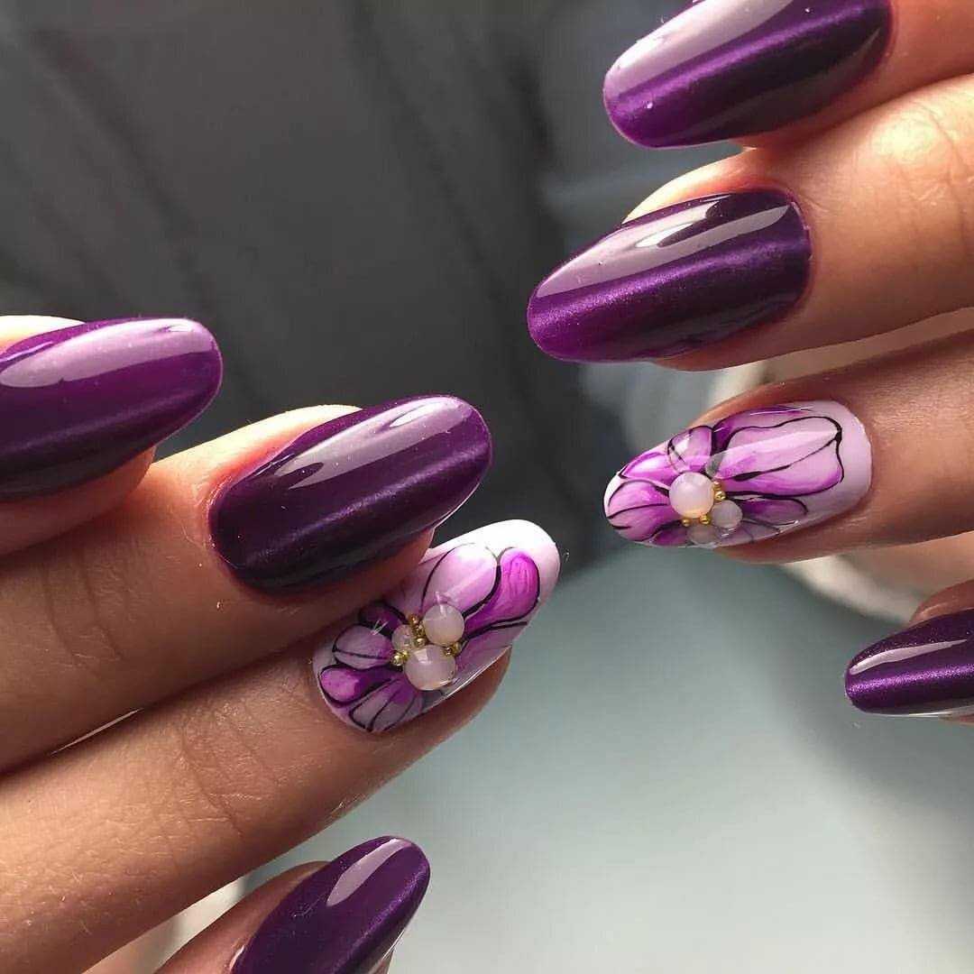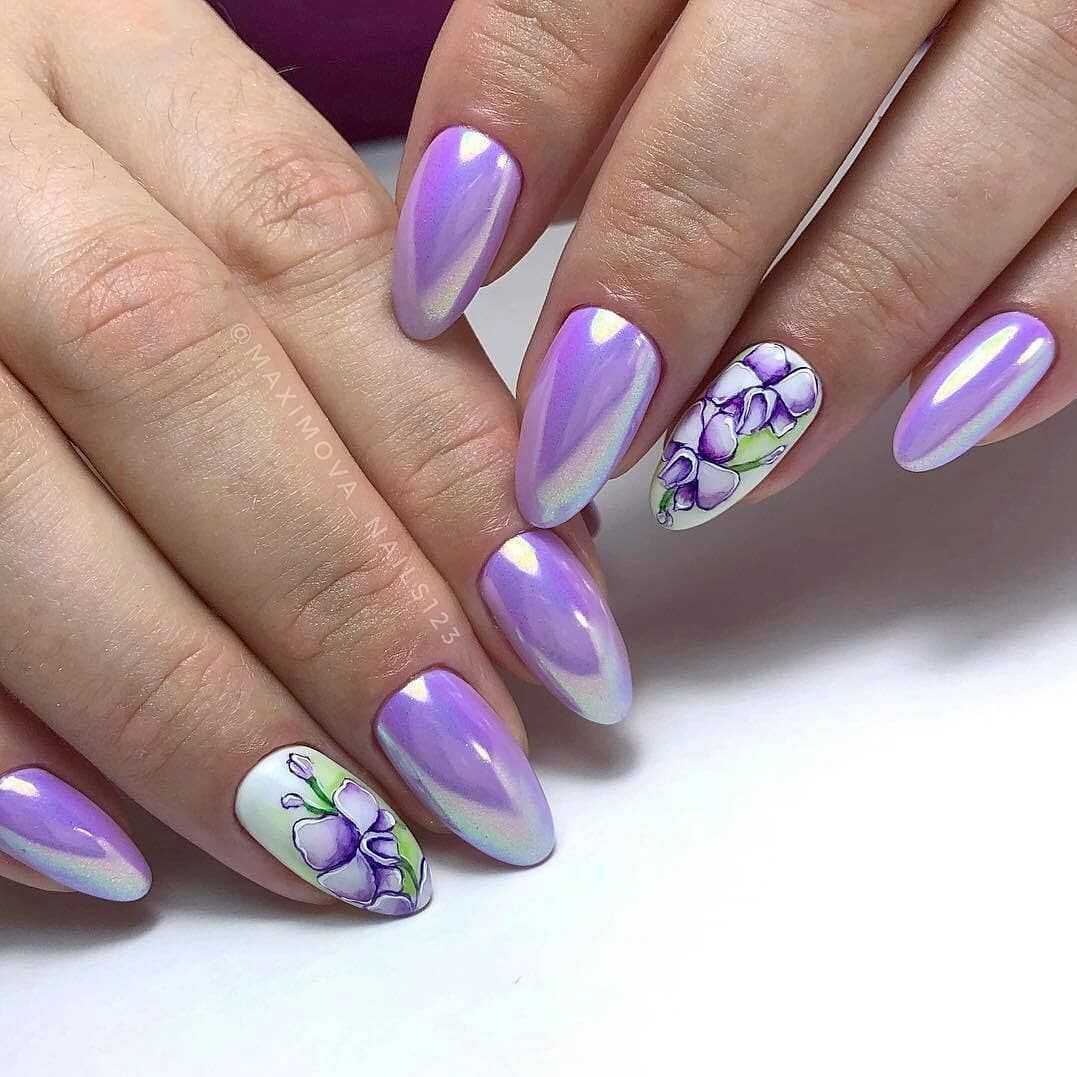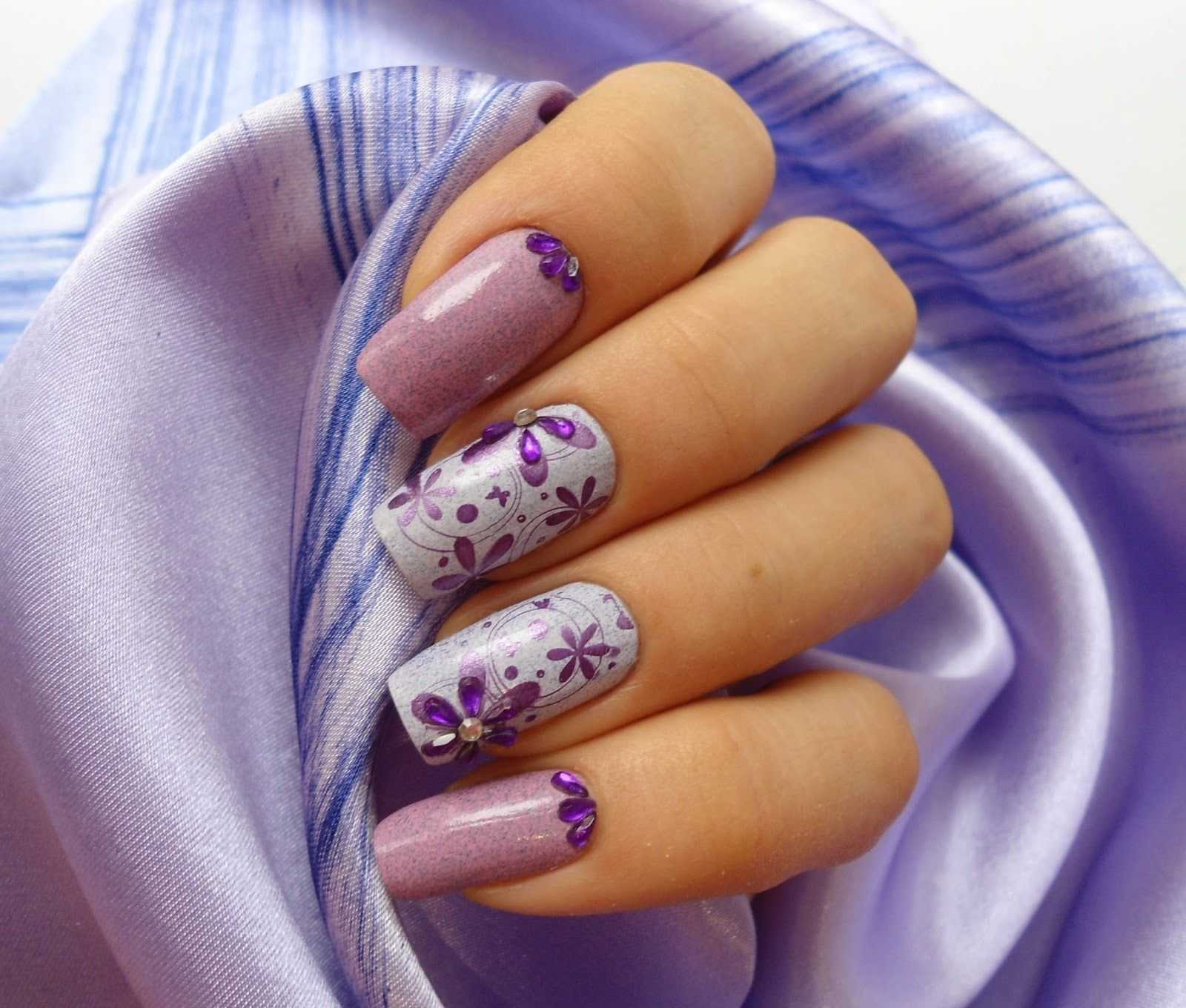 Фиолетовый маникюр с дизайном в нежной, романтичной и милой цветочной тематике придаст девушке шарма и изысканности