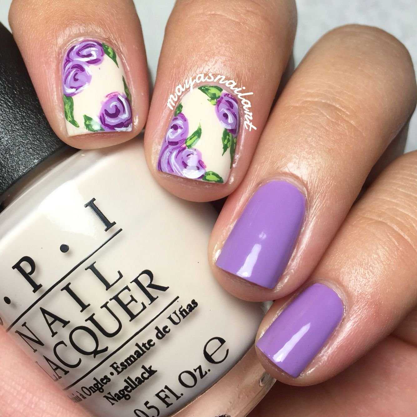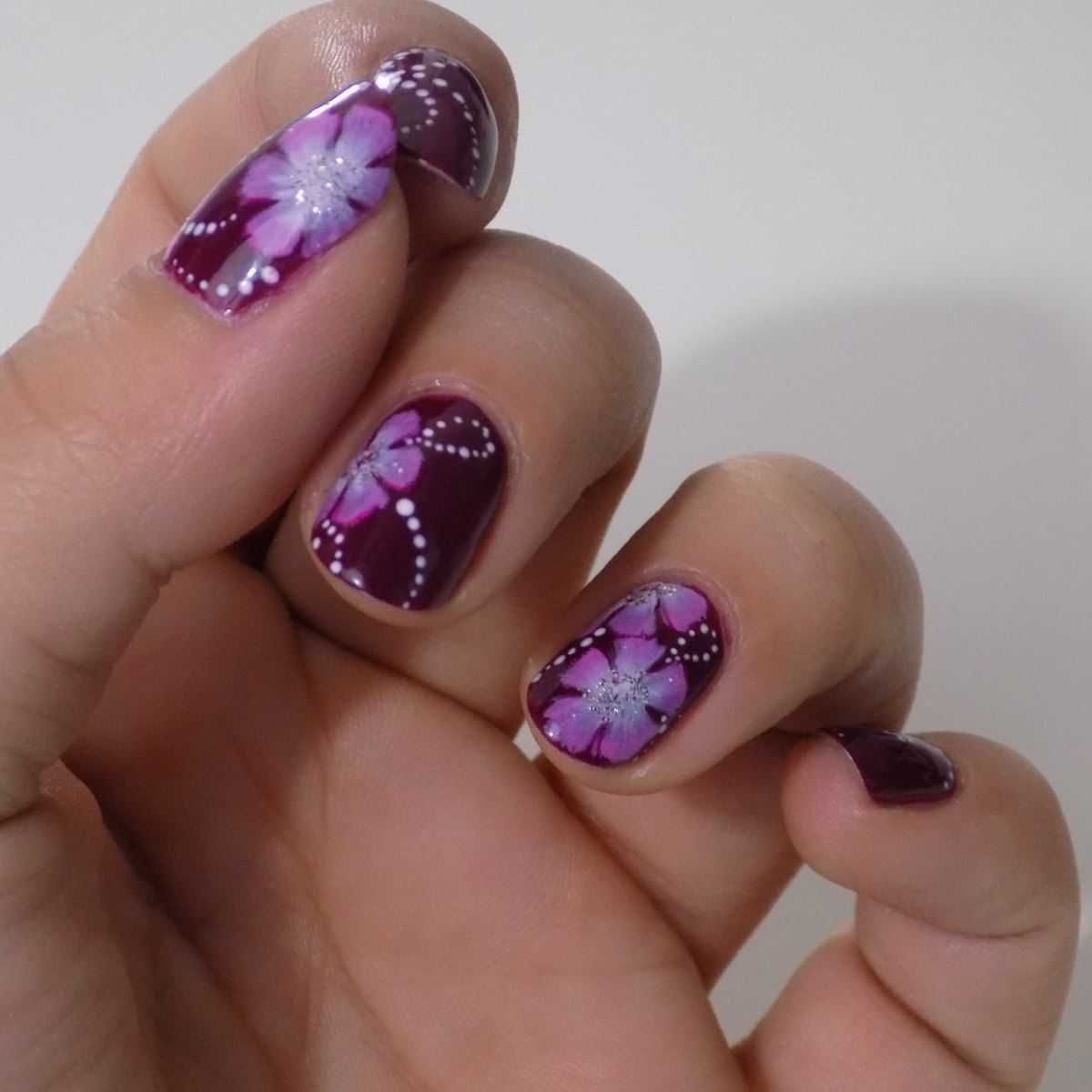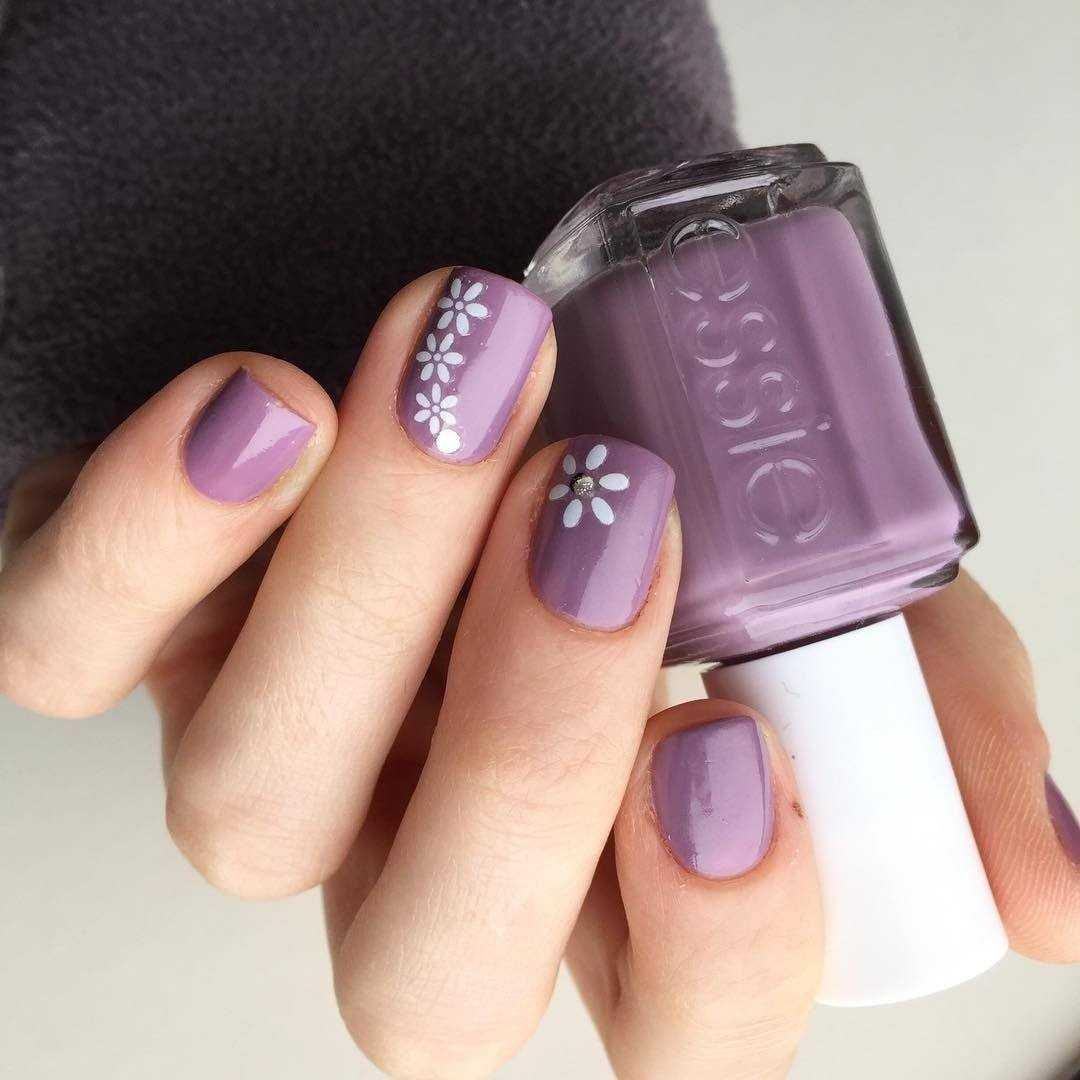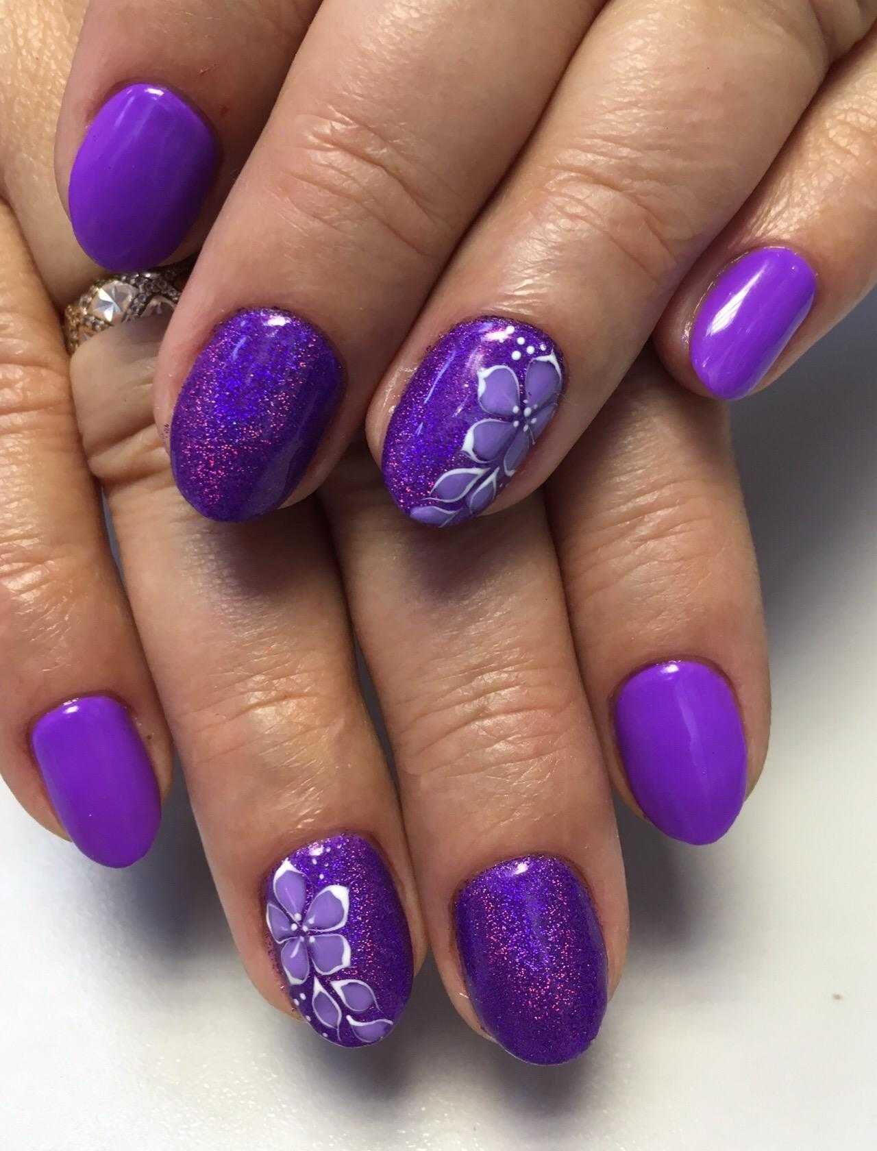 Фиолетовый маникюр с дизайном в нежной, романтичной и милой цветочной тематике придаст девушке шарма и изысканности