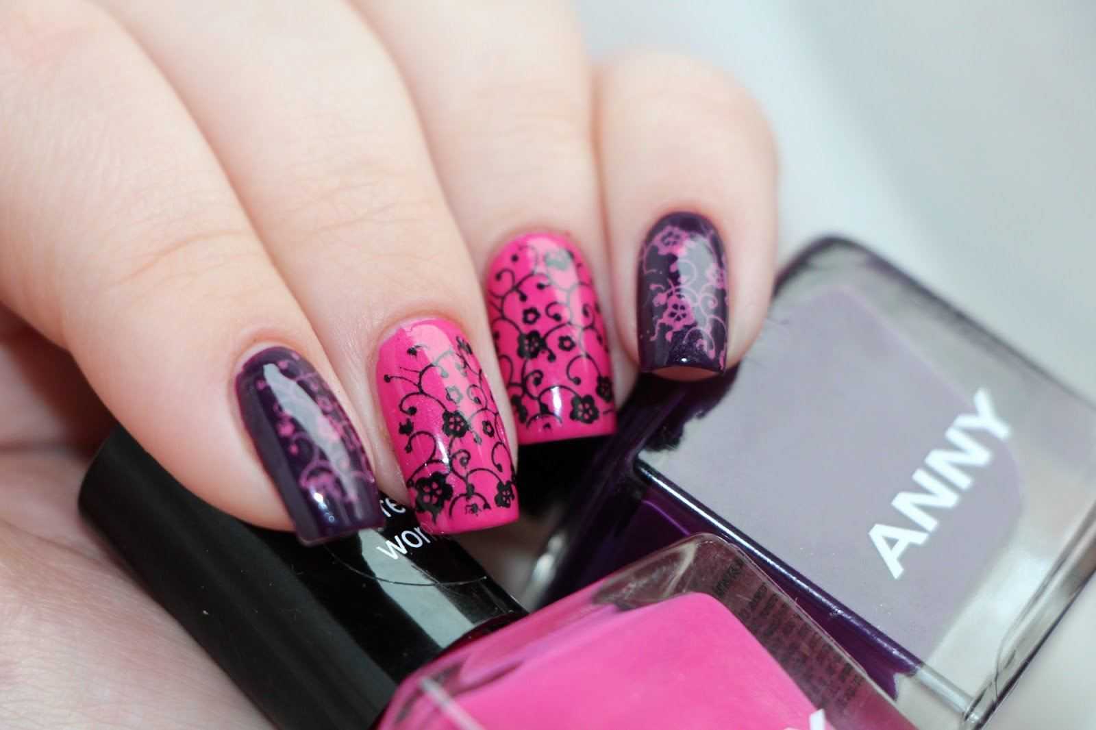 Со светло-фиолетовым хорошо сочетаются нежные, пастельные тона розового. Более насыщенные оттенки подойдут для ярко- или темно-сиреневого маникюра. Розовый широко используют при создании градиента, нанесении цветочных рисунков.