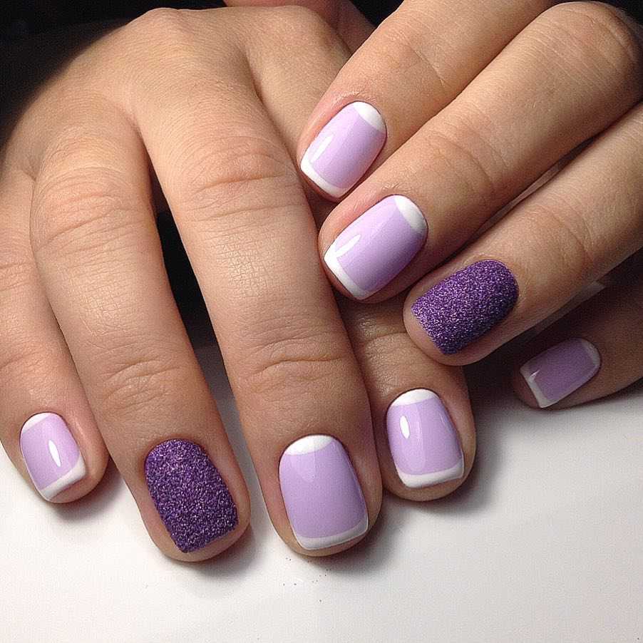 Сегодня просто бум на французский цвет – выбор оттенков огромен. Не менее важным является французский в сиреневых тонах с блестками. Дизайн ногтей, сочетающий белые кончики, сиреневый градиент и базовое покрытие того же цвета, исключительно шикарен. Разве это не произведение нейл-арта?