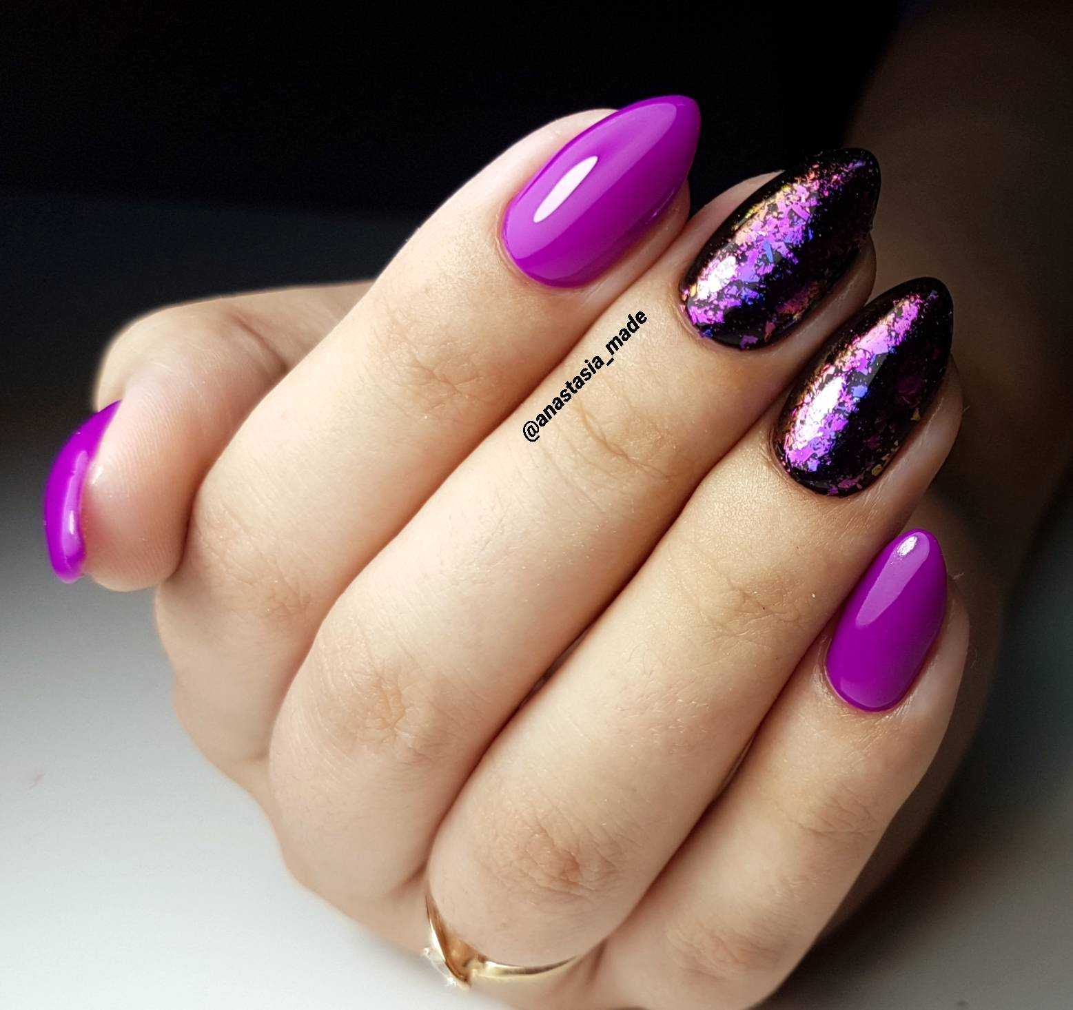 Здесь очень важно подобрать оттенки для дизайна. Главное, чтобы маникюр не был слишком тяжелым и мрачным. Отличный вариант — черно-сиреневый градиент, украшение сиреневой базы хлопьями юкки черного цвета или блестками