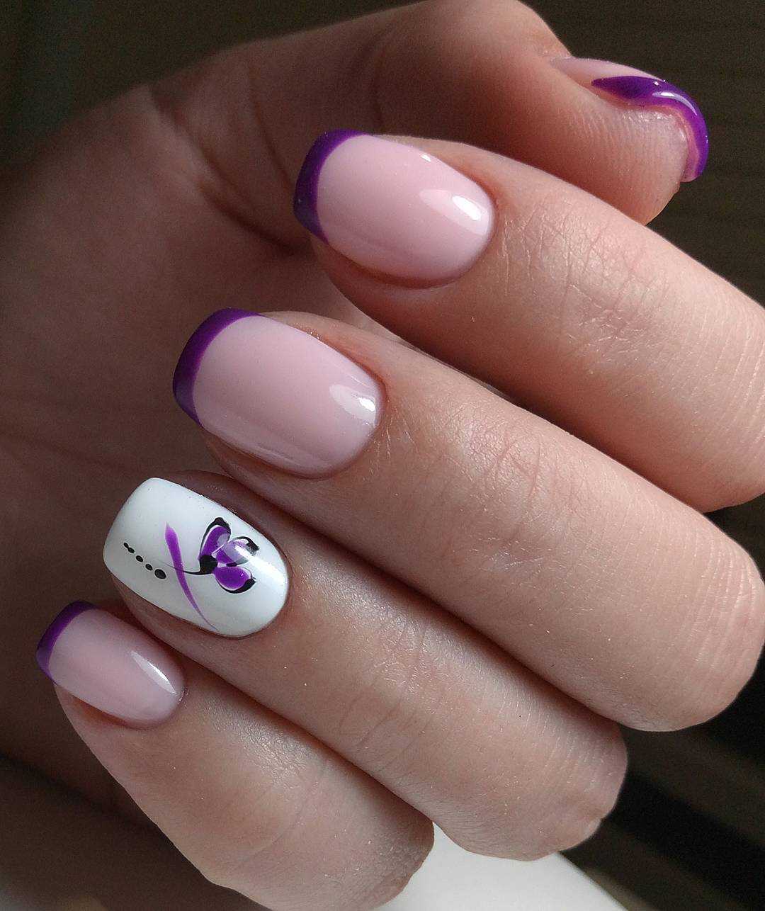 Очень ценится комбинирование нескольких оттенков в одном дизайне, украшение маникюра пудровыми или объемными бутонами, яркий и нежный дизайн, фиолетовый френч с цветочными мотивами, рисунки в стиле минимализм и другие необычные идеи исполнения.