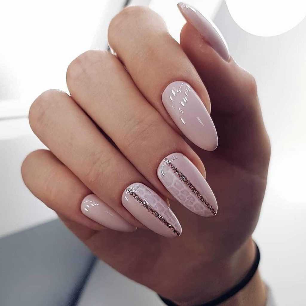 Такой вариант относится к популярному стилю nude. Он лаконичен и прост в исполнении. Интересно будет смотреться игра фактур, когда на матовой основе рисуется рисунок похожего оттенка, но с глянцем. Более праздничная вариация включает в себя различные стразы, блестящие элементы. Конечно не обязательно ими усыпать все ногти, тем более это будет выглядеть безвкусно. Лучше сделать такие акценты на 1-2 пальчиках. Тем самым вы добавите пикантную нотку в нейтральный дизайн и при этом не утяжелите его.