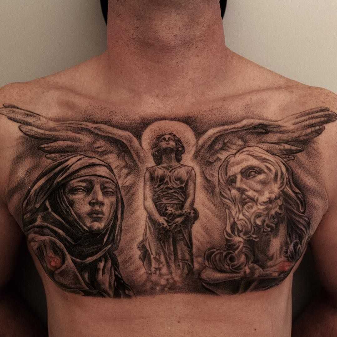 - на груди, спине, боках гармонично будут смотреться сложные крупные рисунки, целые композиции, состоящие из разных персонажей предметов, символов и надписей, например, лики святых и иконы, распятый Христов, сюжеты из Библии;