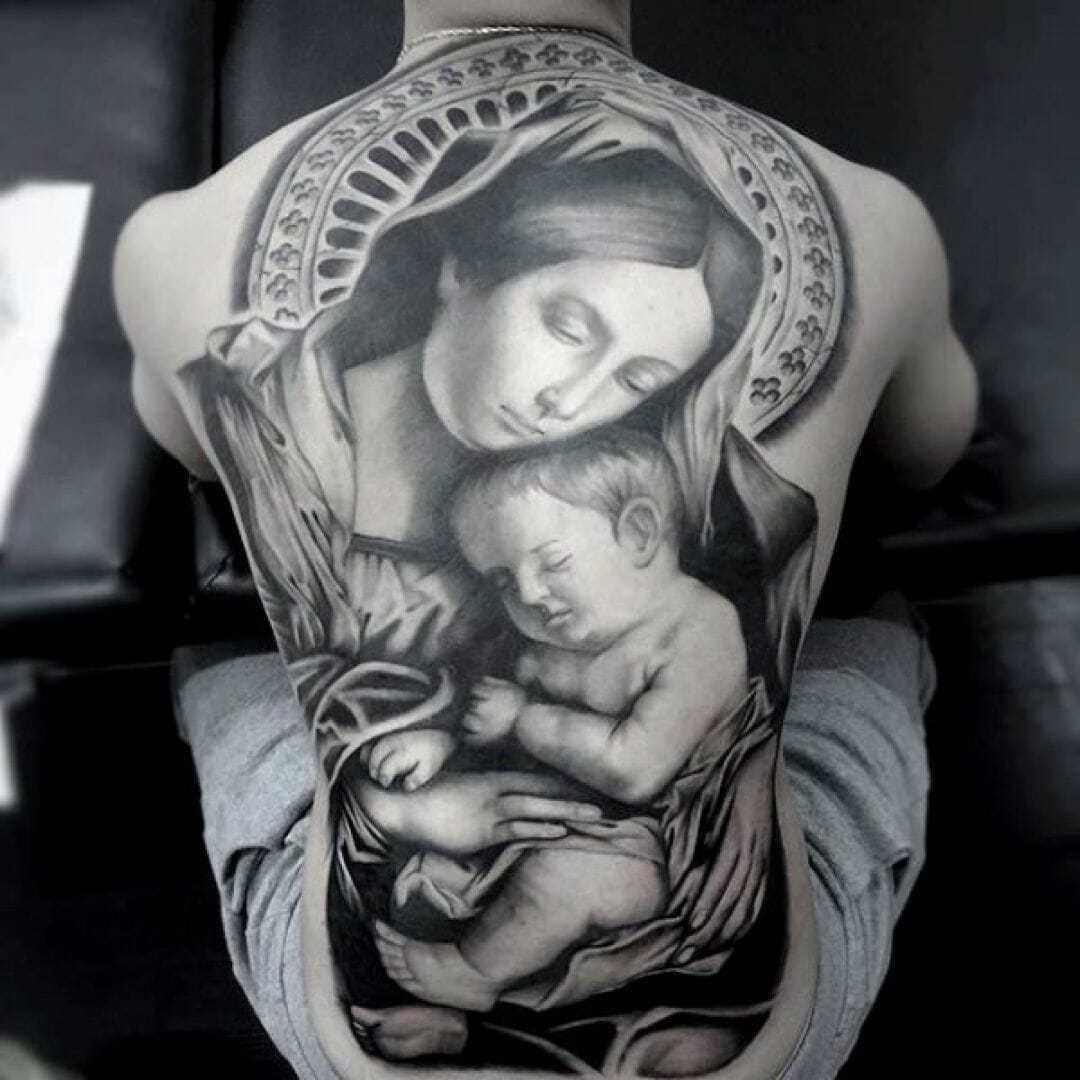 Сделать тату можно в принципе на любом участке тела. Однако религиозная тематика имеет ряд негласных ограничений. Один из самых распространённых вариантов – тату божьей матери на спине. Пространство позволяет сделать детальное изображение. Чаще всего в каноническом стиле. Иногда добавляют текст молитвы или важные для человека надписи.