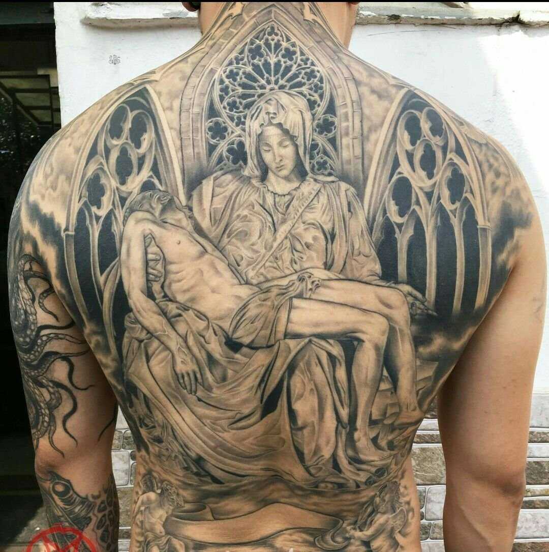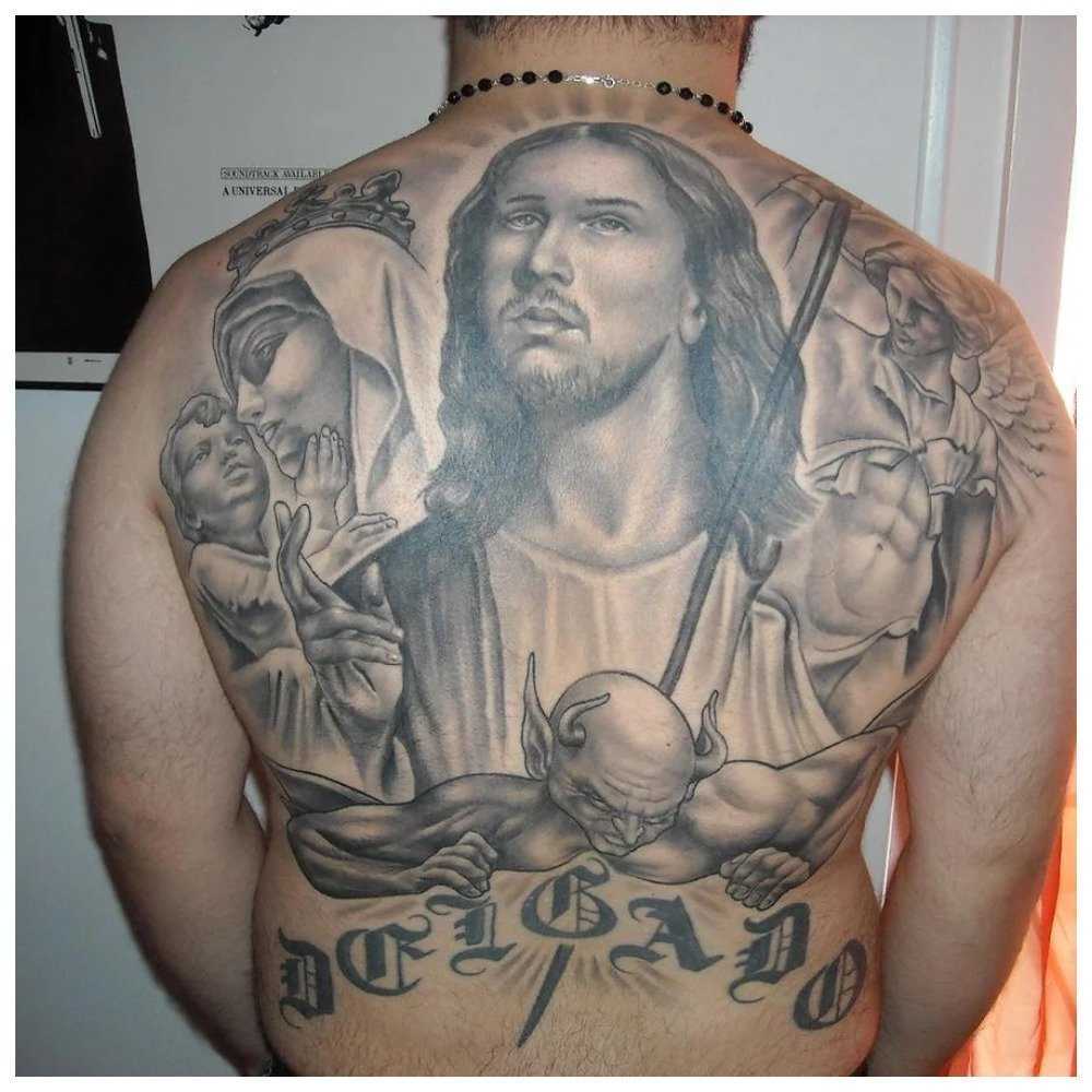 Тот кто предпочитает масштабные татуировки, выбирают для нанесения спину. Так как область спины достаточно большая, что даёт разгуляться фантазии мастеру совместно с предстоящим обладателем тату. Татуировка может быть выполнена как распятие или какая-либо библейская сцена, к примеру, Христос, который несёт крест на холм Голгофа.