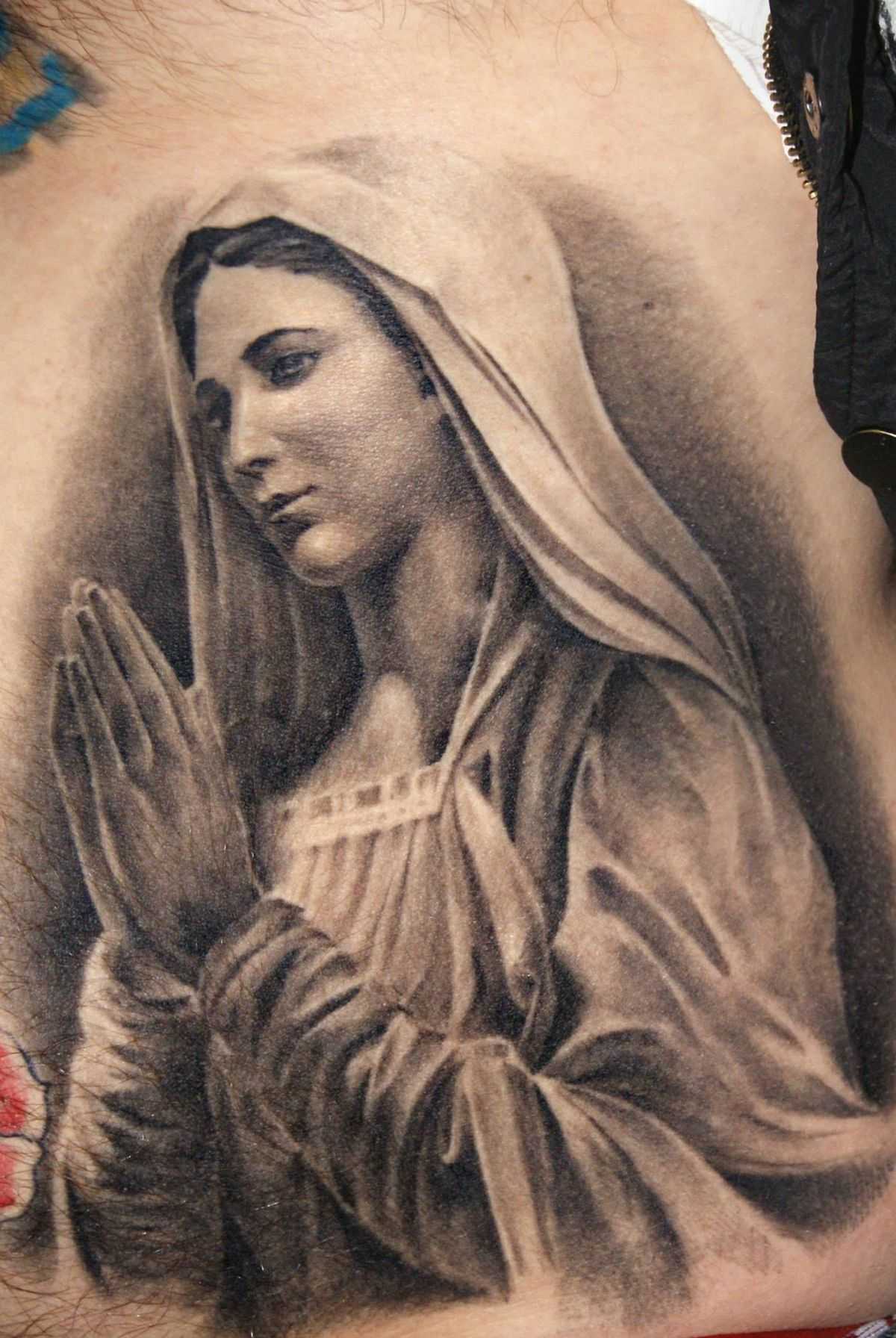 Дева Мария с крестом и церковными куполами на заднем плане имеет значение тюрьмы. Их почти всегда носят мужчины, отбывшие наказание в тюрьме. Они не имеют христианского смысла, а лишь символы, связанные с тюремной субкультурой. Эти татуировки большие.