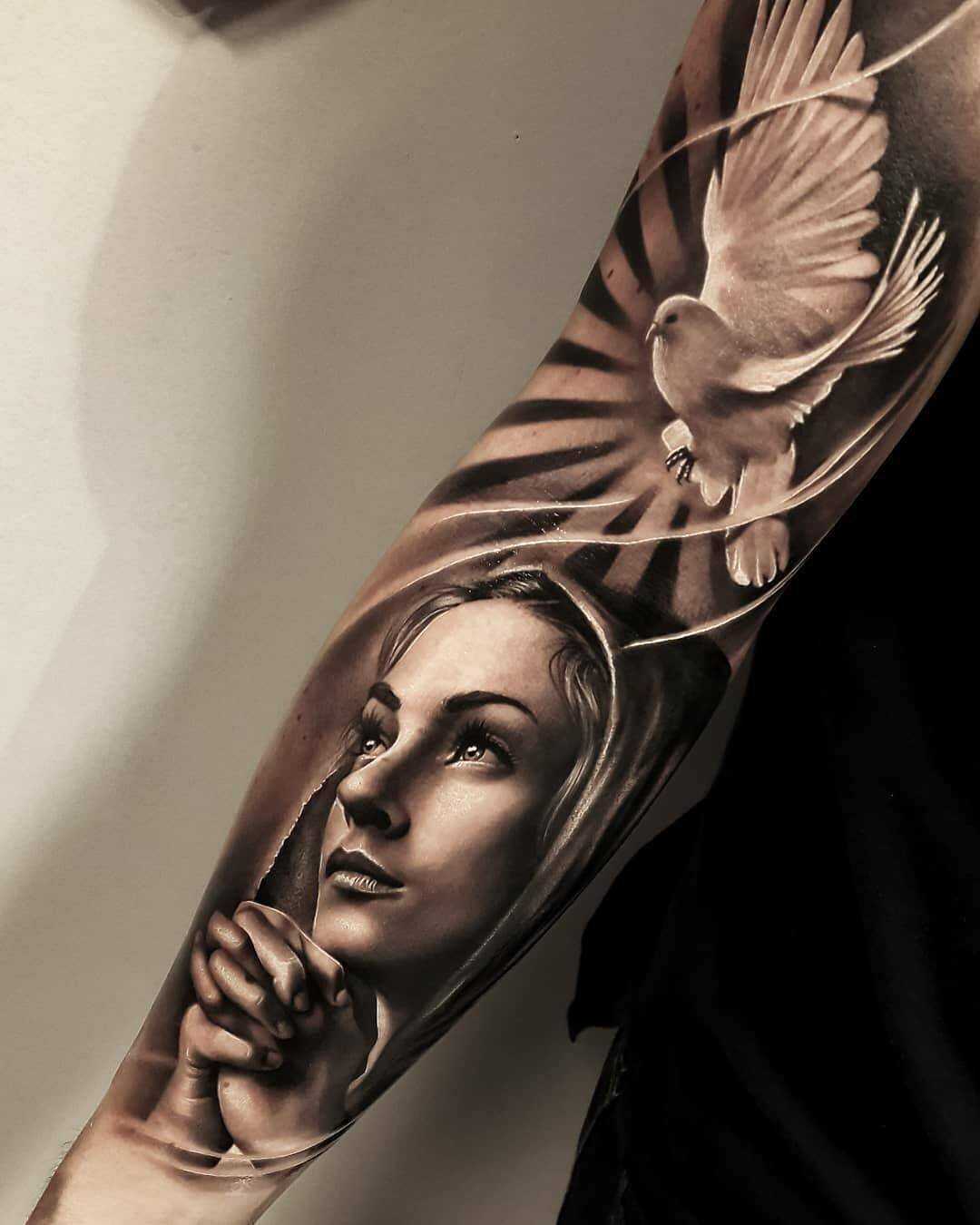 Не менее популярен и вариант тату божьей матери на руке. Здесь изображение будет заметно меньше, однако всё равно выглядит эффектно и завораживающе. Предпочтения людей равномерно распределились между тату божьей матери на плече и предплечье.