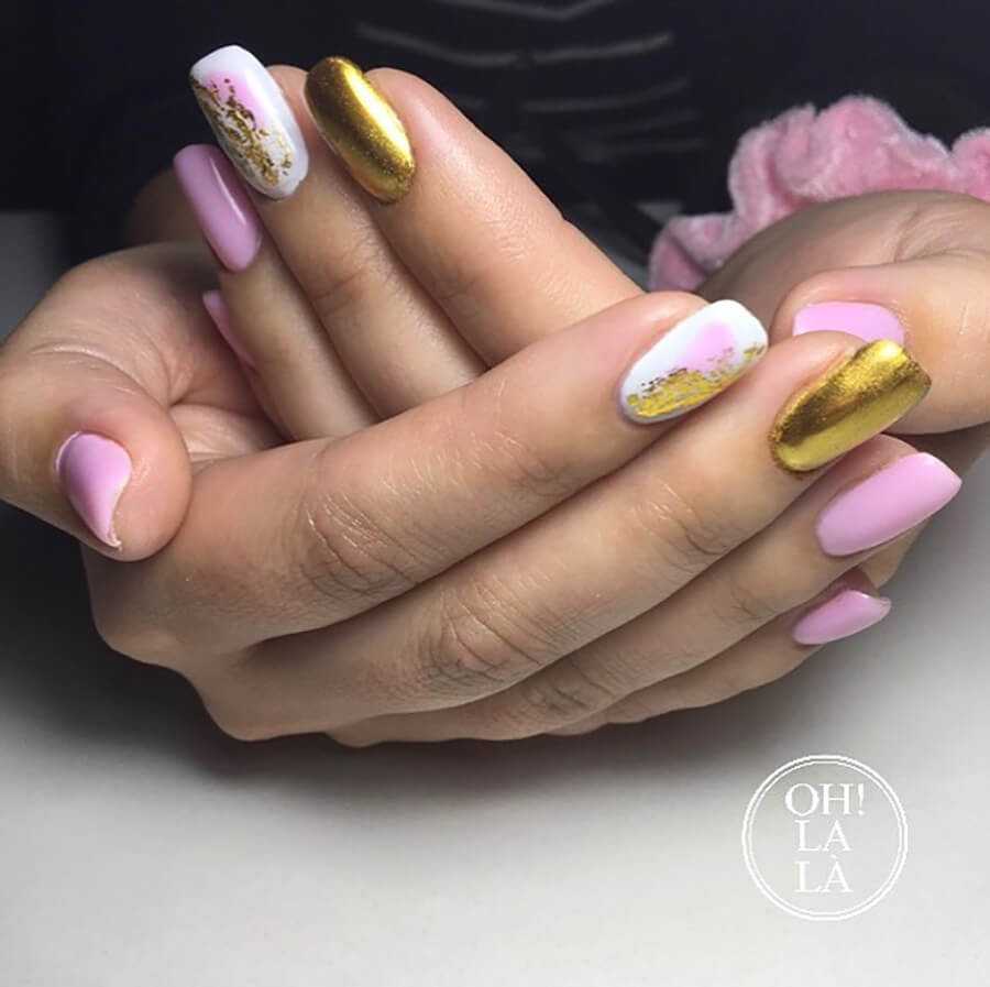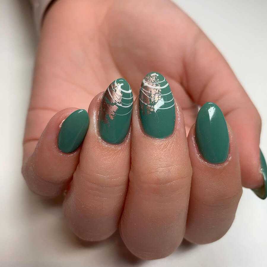 Овальна форма любит блестящий декор, который может выражаться в фольге, втирке, блестках. Все это допускается использовать на подобной длине, но не в переизбытке, чтобы не перегрузить маникюр. Выкладывать фольгу можно на одном или паре пальцев, что создаст дополнительный акцент, но не сделает внешний вид слишком броским.