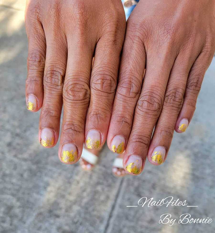 Очень хорошо сочетается золото с нюдовым покрытием на коротких ногтях. Такой аккуратный и опрятный маникюр можно смело носить в повседневной жизни.