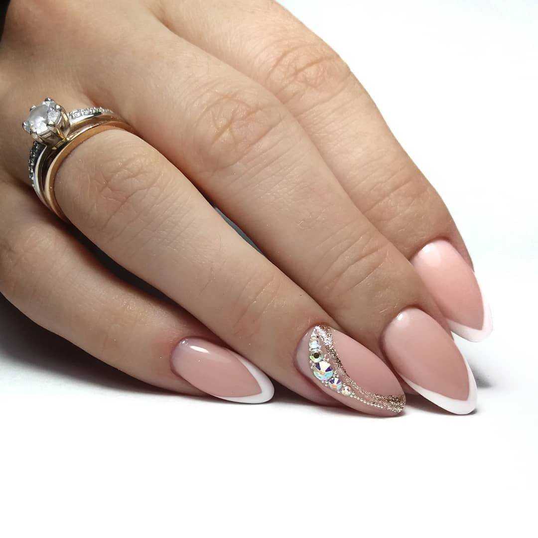 Существуют также варианты острой или миндалевидной формы. Чаще они используются для нестандартных вариантов френча, и довольно сильно отходят от оригинальной концепции. Такой вариант маникюра в качестве свадебного френча можно выполнить различной формы.