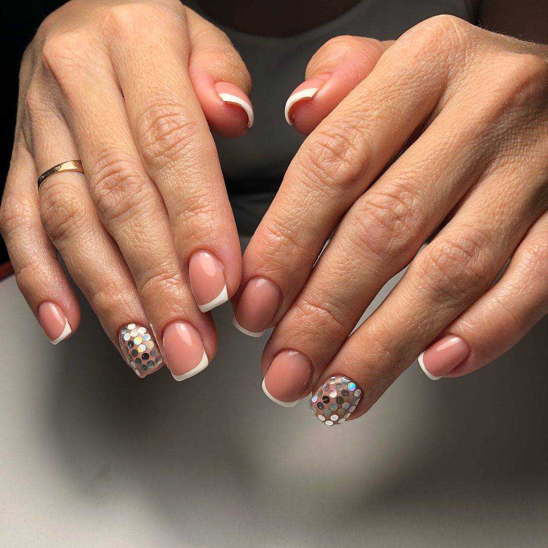 Часто блестками украшают кончик ногтевой пластины или базальную область, благодаря этому получается акцент в маникюре. В основном это делается только на нескольких ногтях. Этот вариант отлично подойдет для любого случая, потому что он не слишком яркий и выглядит нежно. Также многие мастера по маникюру используют блестки только в качестве акцента, а именно украшают рисунки. То есть изначально французский маникюр сочетается с монограммами, геометрическим рисунком, кружевными вставками, когда все готово, дизайн можно подчеркнуть блестками. В результате получается роскошный объемный маникюр с мерцающими деталями. Он подходит для любого случая, поэтому в 2020-2021 году он особенно актуален.