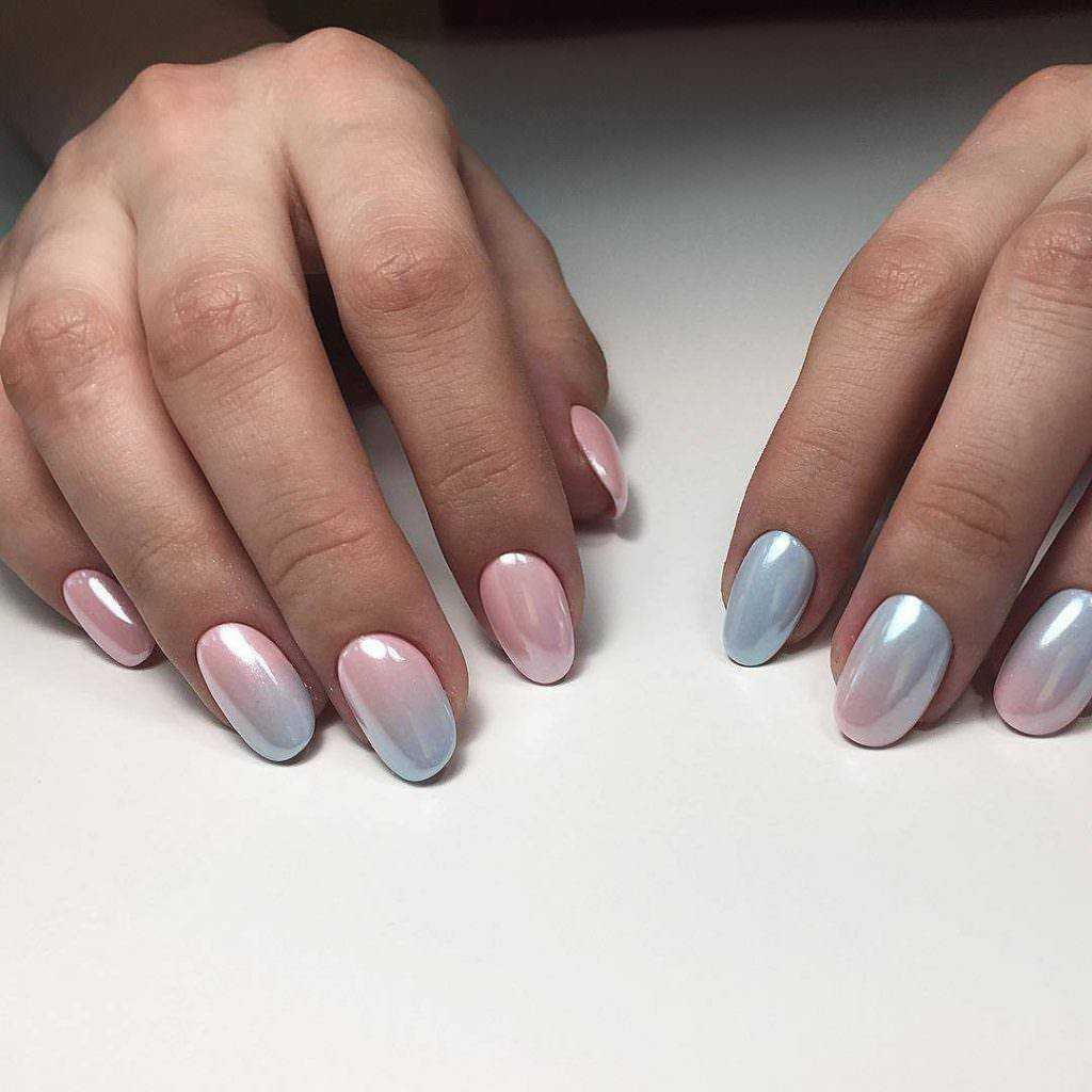 Можно пойти по простому пути и сделать все пальчики одинаковыми, но можно выполнить уникальный маникюр, который, несомненно, привлечет множество восхищенных взглядов. Например, на трех пальчиках выполнить переход от пастельного тона к насыщенному сверху вниз, а на двух – в зеркальном отражении, снизу вверх. То же самое можно проделать и с контрастными цветами.