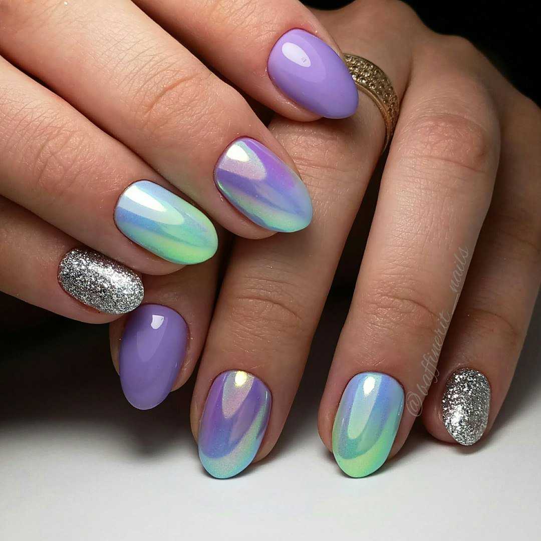 Для получения градиента на ногтях можно использовать не только блестки, но и лаки с голографическим эффектом. Они дополнят эффект омбре радужными переливами, благодаря которым такой дизайн будет выглядеть необычно и празднично.