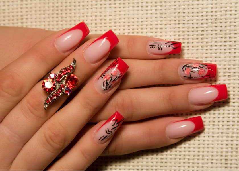 По желанию дизайн можно украсить при помощи кружева или рисунка. Еще одна новомодная идея выполнения френча данными цветами – это применение негативного пространства. Основную часть ноготка нужно выполнить красным тоном, при этом оставляя пространство посередине или сверху ноготка.