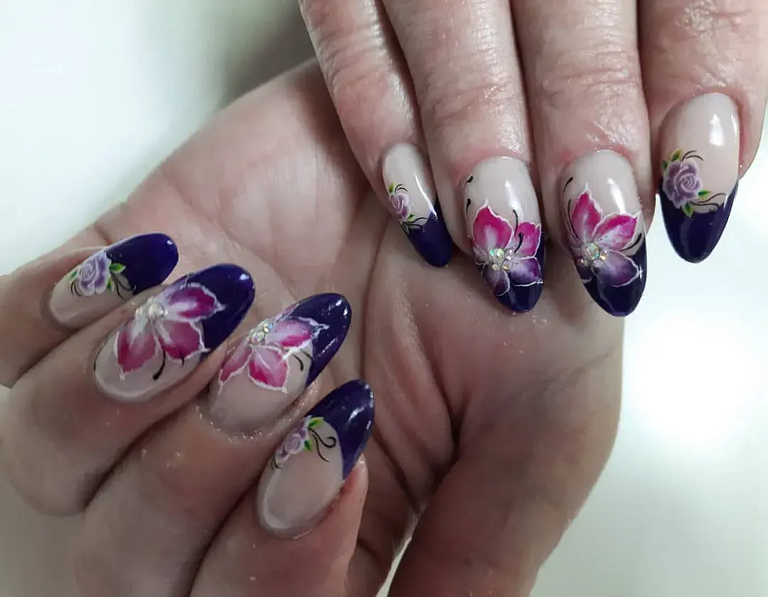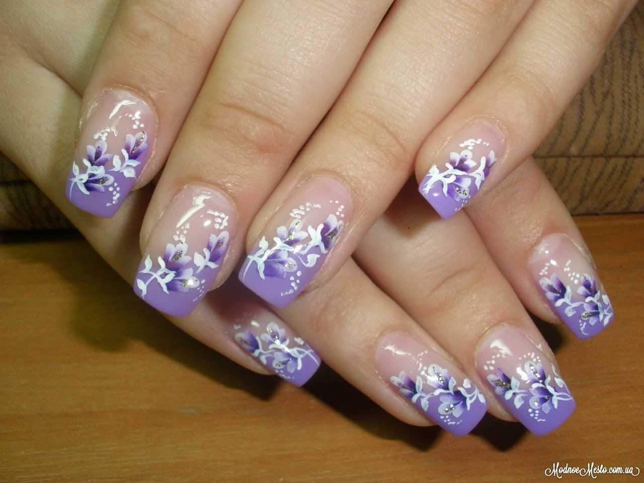 Не менее популярный рисунок, который отлично смотрится в сочетании с френчем – флористический. Опытные нейл-мастера делают потрясающие шедевры с помощью нескольких кистей и акриловых красок.