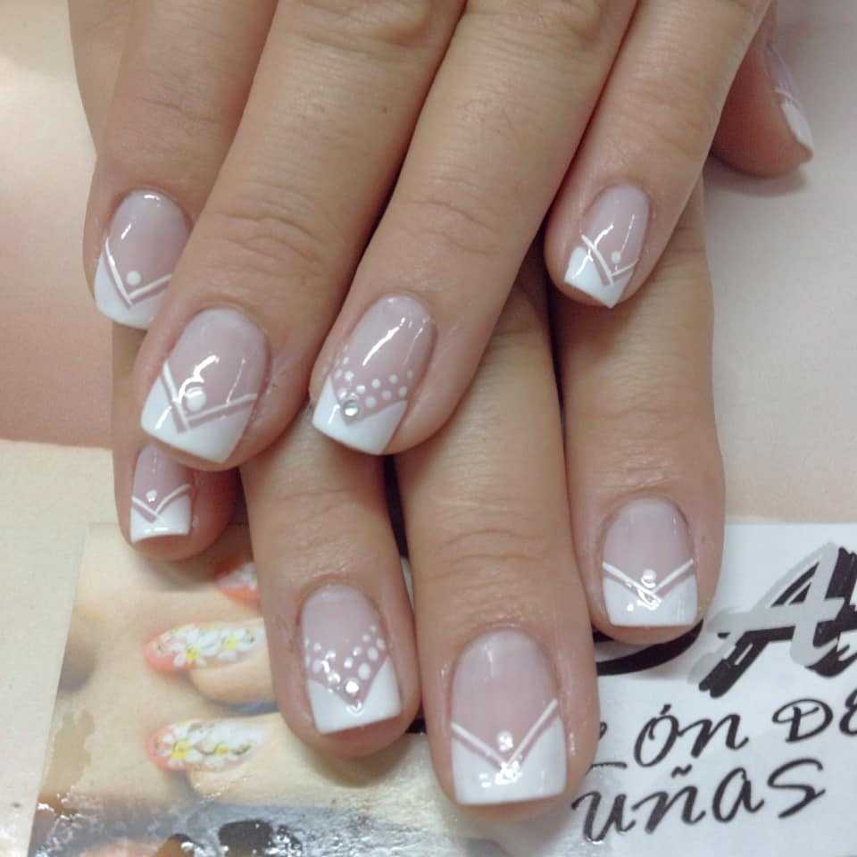 Как уже говорилось выше, классический френч – это база, поэтому можно смело дополнять ее различными рисунками. К примеру, геометрический дизайн часто бывает насыщенным, дерзким. В данном случае это неприемлемо, ведь намного более интересно будут смотреться легкие минималистичные линии или фигуры. Такое сочетание – прекрасное решение даже для повседневной жизни.