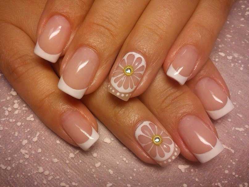 Нередко белый френч дополняют мелкими стразами на безымянном пальце, что добавляет дизайну нежности и женственности.