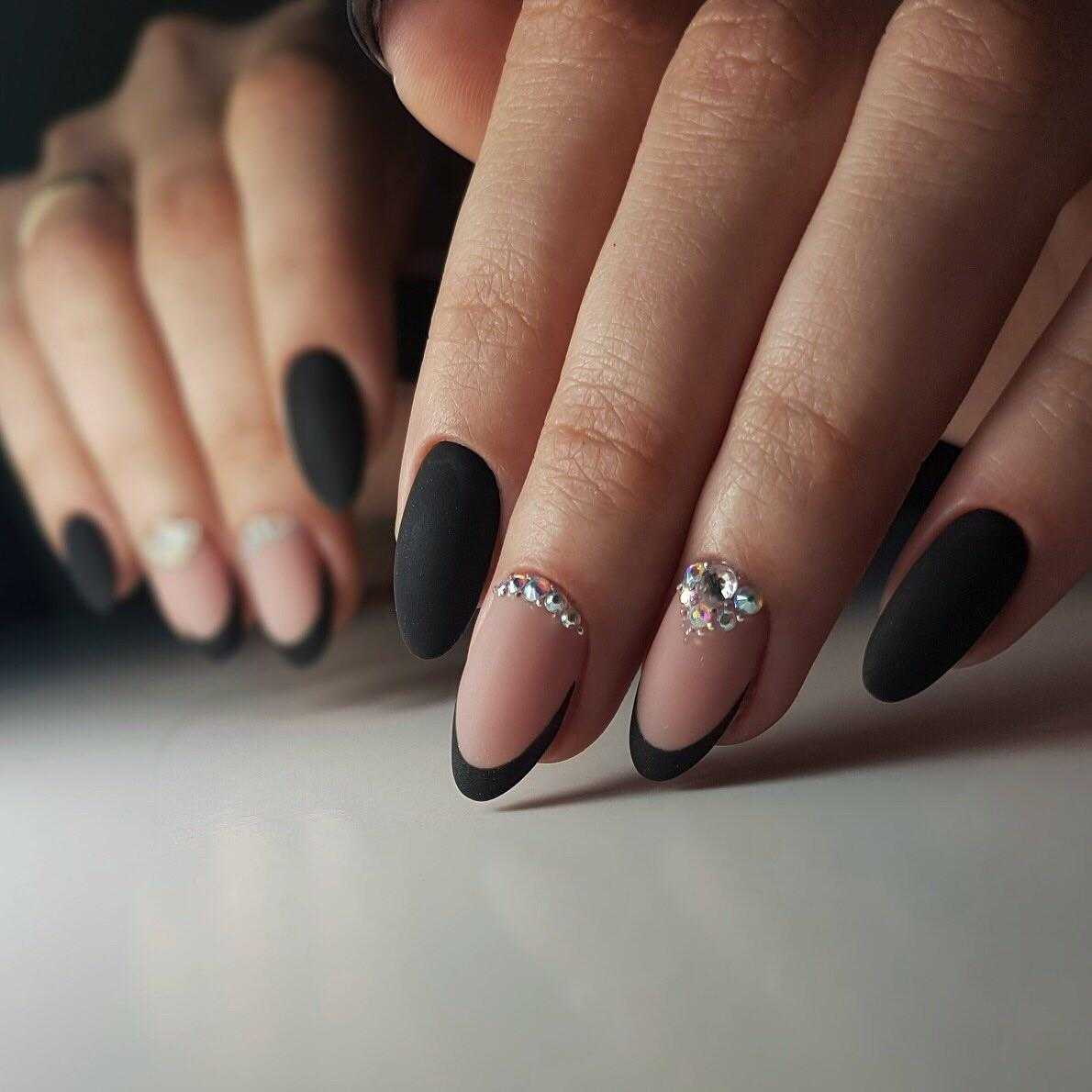 Не смотря на всю свою глубину и некую мрачность, чёрный во французской технике смотрится очень красиво и утончённо. Использование такого цвета в маникюре всегда подразумевает его дополнительное декорирование, и стразы, в нашем случае, актуальны в оформлении как никогда. Наилучшим местом для расположения украшений, по-прежнему, остаётся линия улыбки или прикорневая область ноготка. Изысканно и очень элегантно смотрится чёрный матовый френч со стразами. В этом примере можно дополнительно покрыть несколько ноготков бархатистым топом полностью или поиграть с формой улыбки. Попробуйте оформить на ногтях двойную или скошенную вариация френча. Вы будете приятно удивлены, насколько свежо и оригинально может выглядеть чёрный цвет в маникюре.