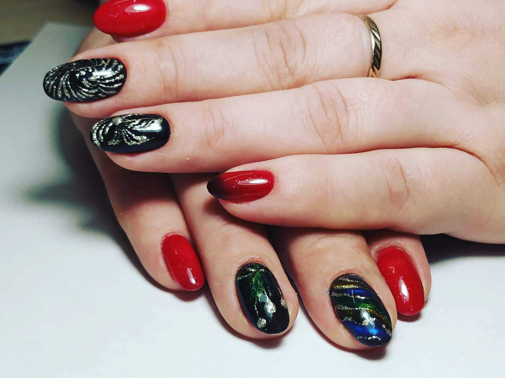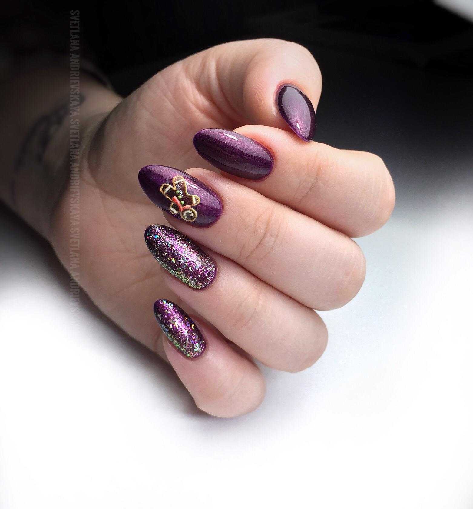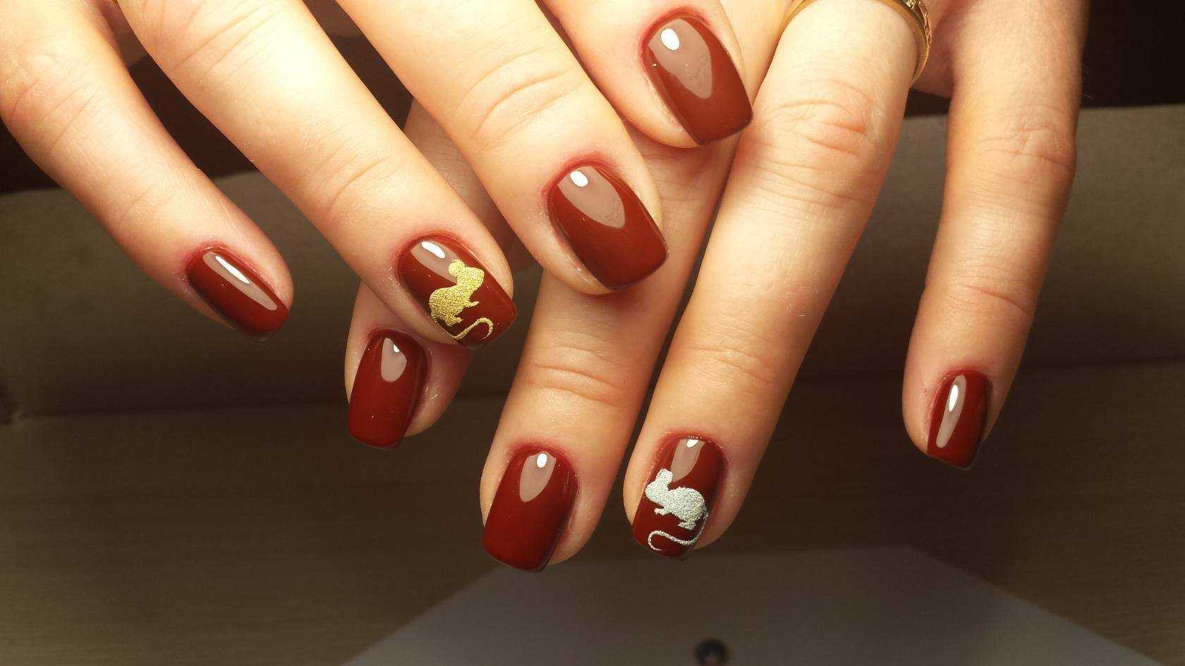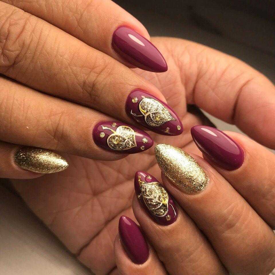 В качестве основы хорошо подойдут, так называемые, бархатные оттенки — бордовый, глубокий изумруд, сапфировый. Можно акцентировать один из ногтей и щедро украсить стразами, имитирующими драгоценные камни, узорами и другим нейл-артом