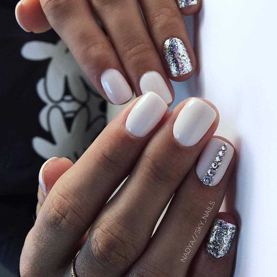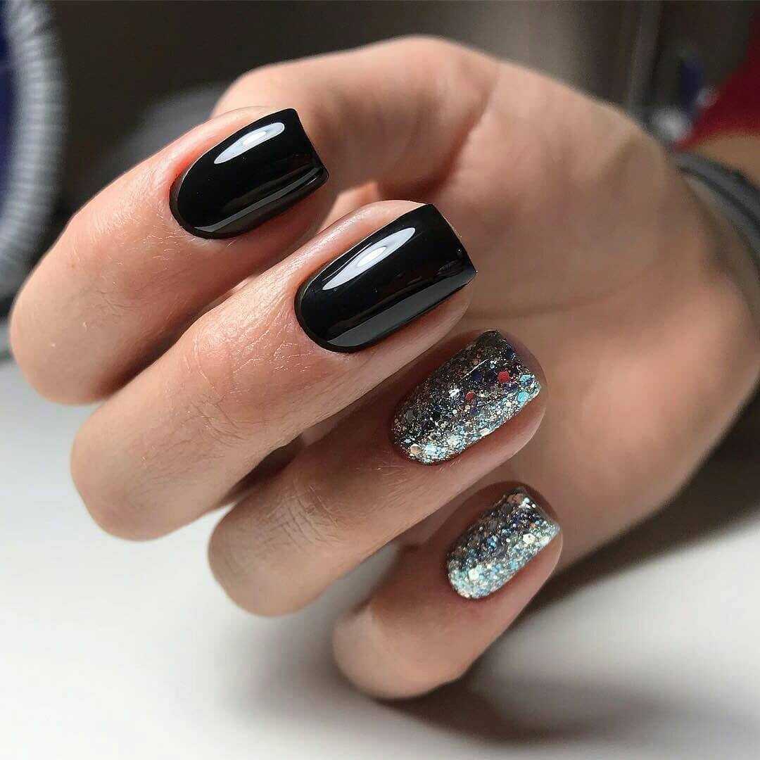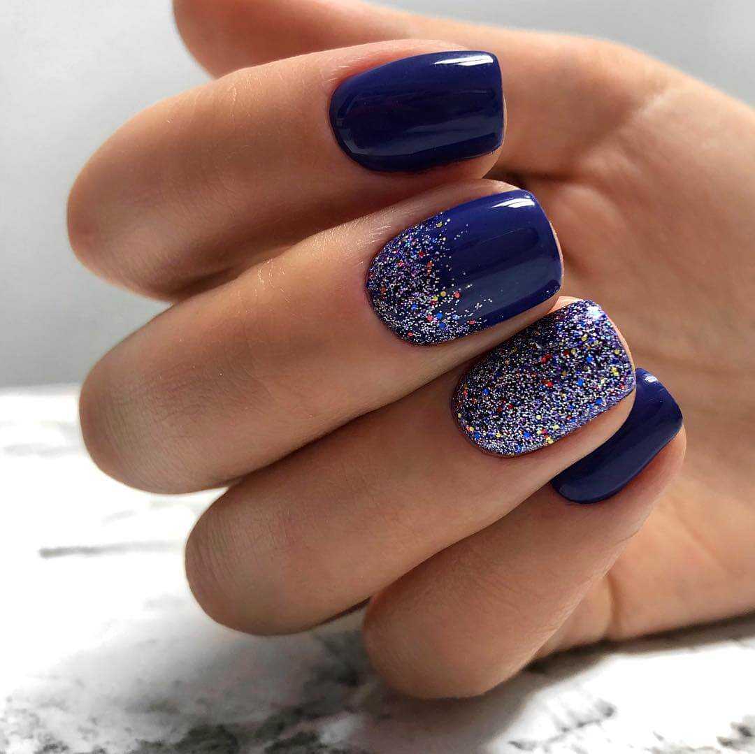 Маникюр с блестками приходится ярким акцентом в образе на коротких ногтях. Блестки, создавая интересную текстуру, не могут остаться незамеченными.