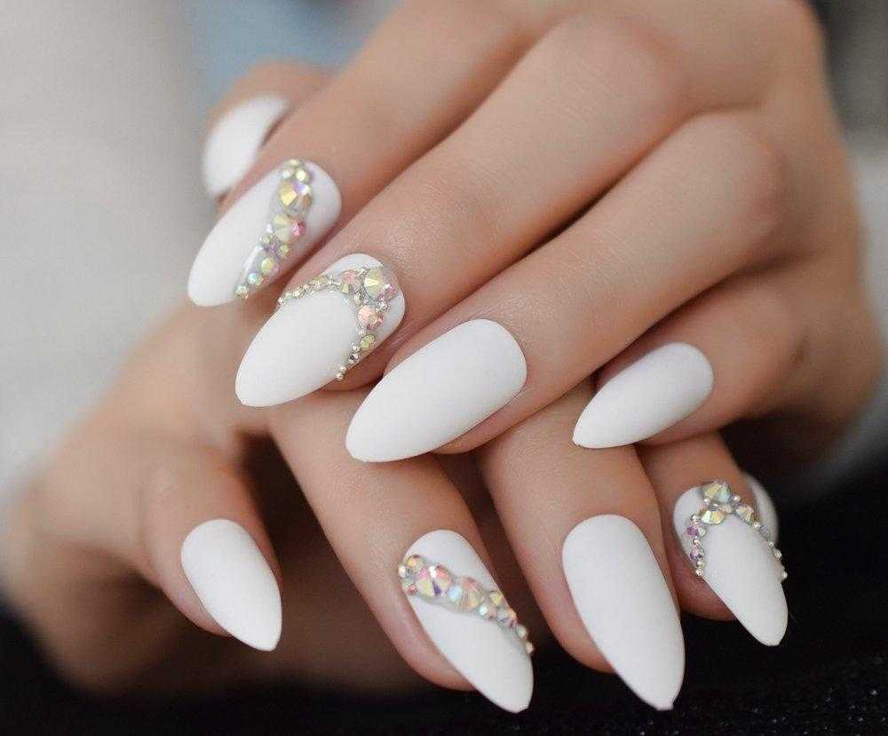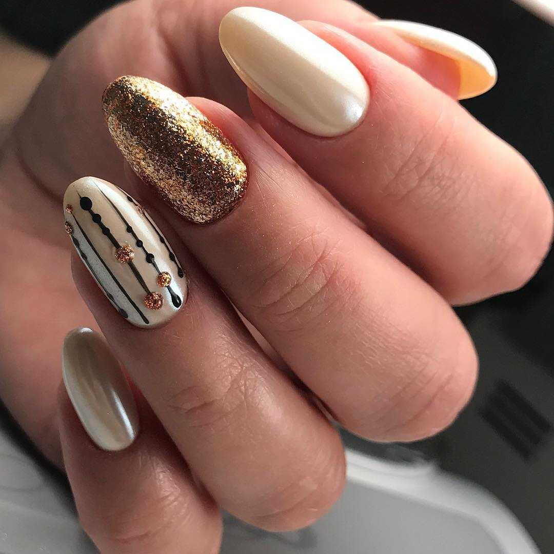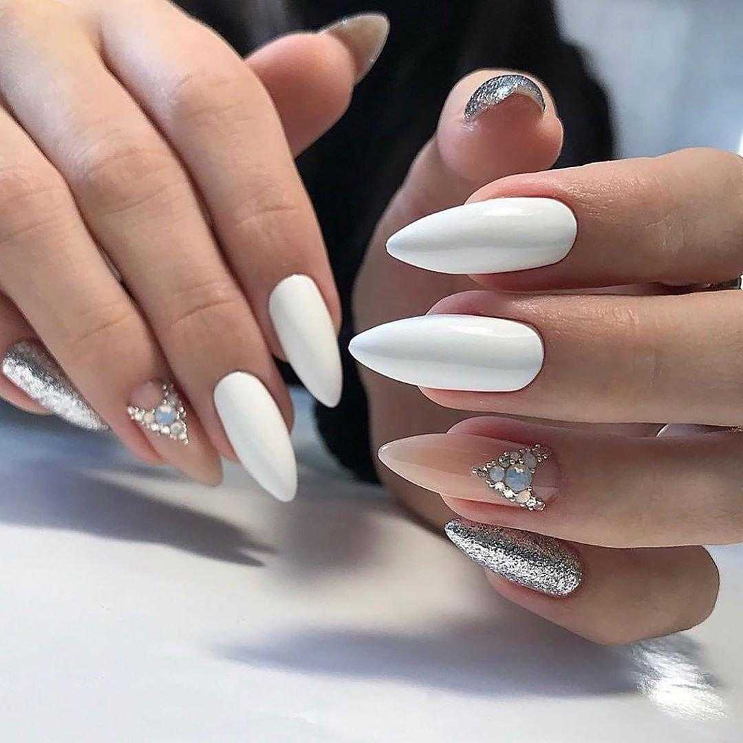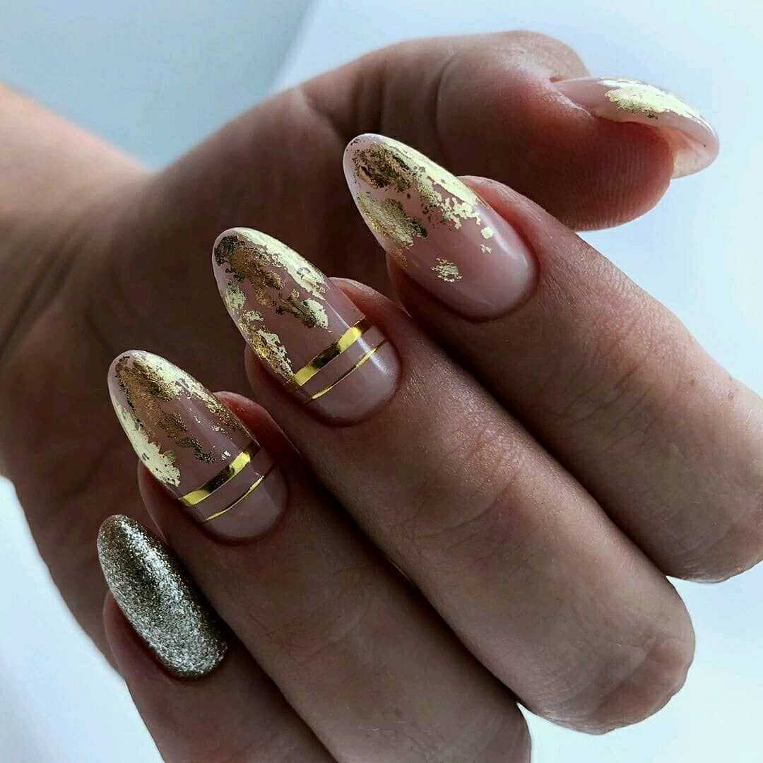 Для миндалевидных ногтей идеальны следующие элементы декора: камушки, фольга, пайетки, полосочки, рисунки. На миндалевидных ноготочках они выглядят элегантно и нежно.