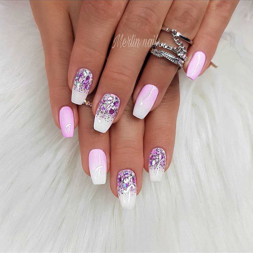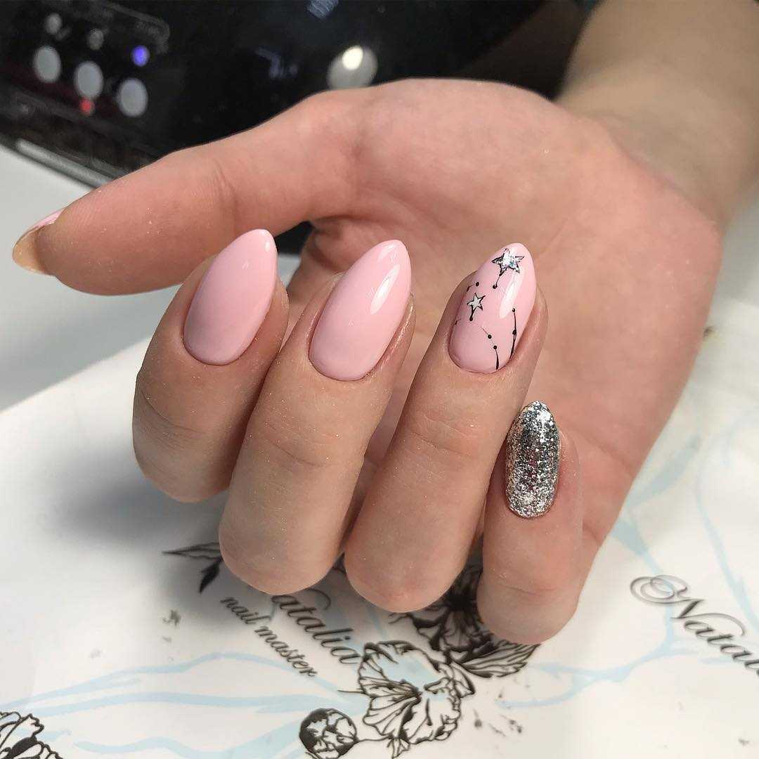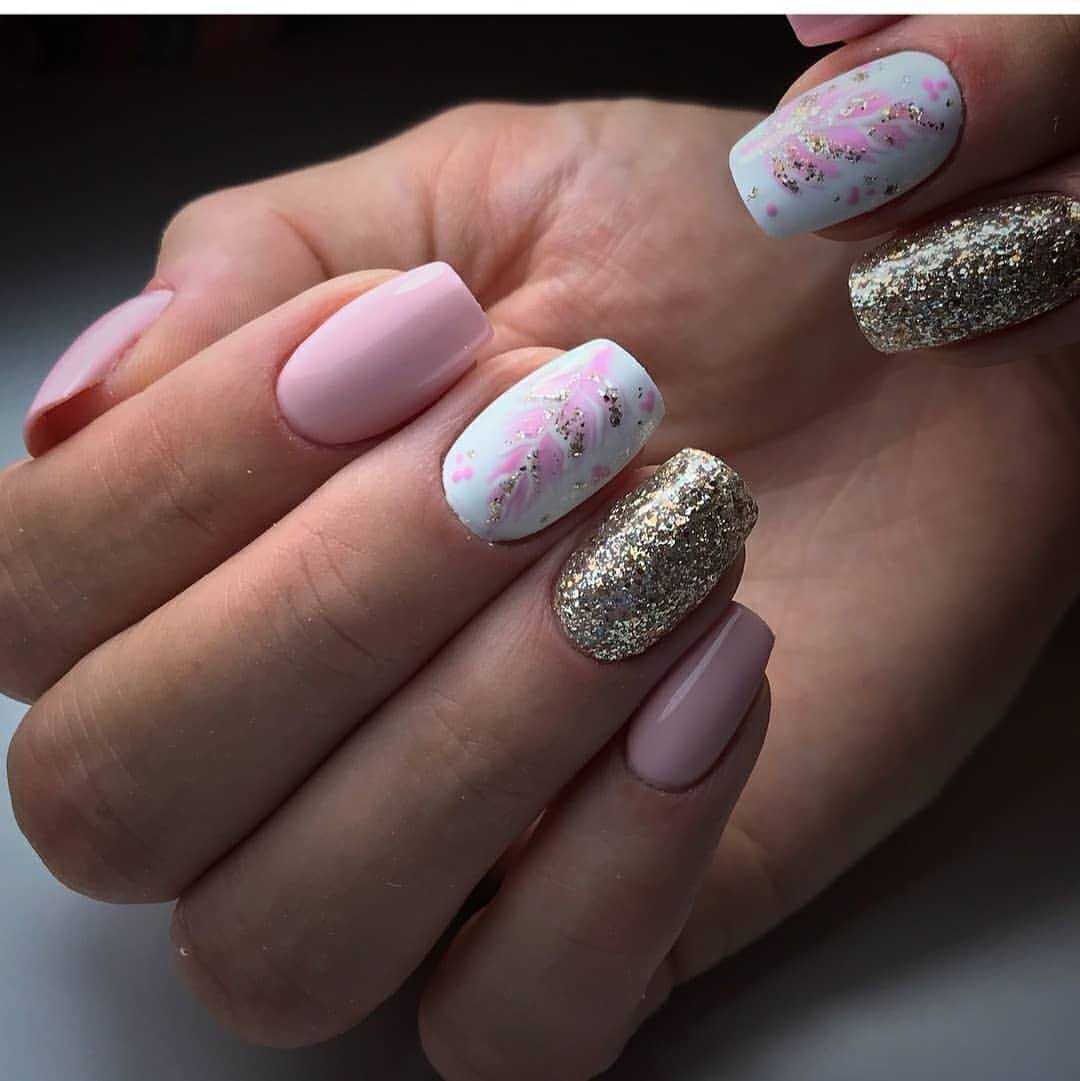 Все оттенки розового великолепно сочетаются с серебряным глиттером, жемчужной втиркой, гель-лаками с пайетками. В розовом цвете чаще всего выполняют французский и лунный маникюр, делают растяжку цвета с белым оттенком, заполняют один из ноготков прозрачными бульонками. В качестве дополнения используйте белый гель-лак. Его можно расположить на одном из ноготков в однотонном покрытии или создать с его помощью геометрический или абстрактный декор.