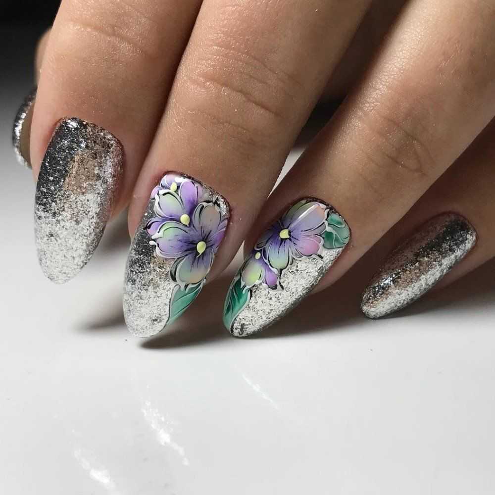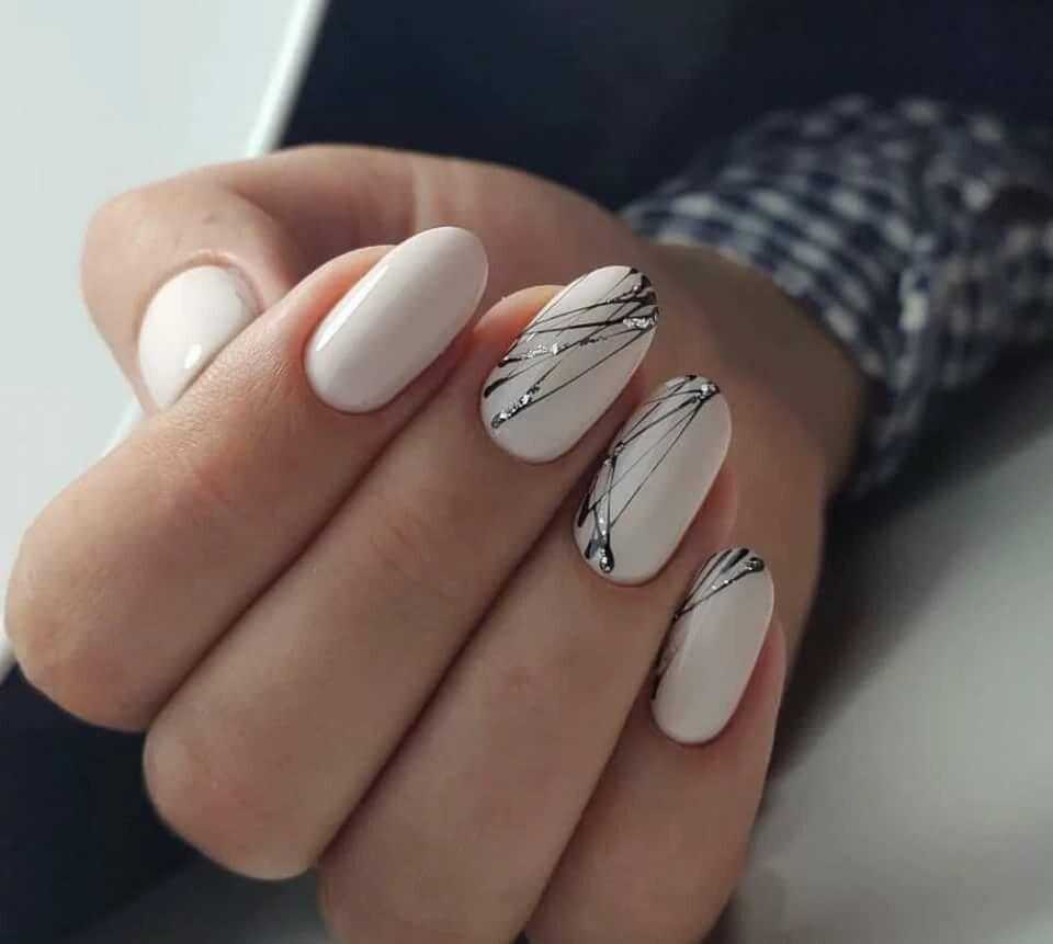 Овальные ноготочки — хит в этом году. Для них подойдет любой дизайн. Выигрышно смотрятся плавные продольные линии. Если хотите подчеркнуть женственность, то отдайте предпочтение рисункам цветов. Такие мотивы подчеркнут изящность.