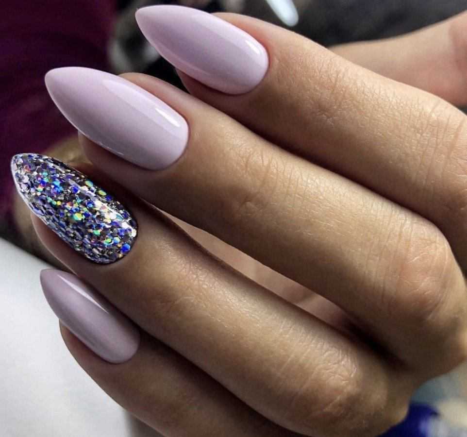 - все ногти, кроме одного, полностью покрывают мелкими блестками. На акцентную пластину наносят однотонный лак, дополняют стразами. Чаще всего выбирают безымянный или средний пальцы;