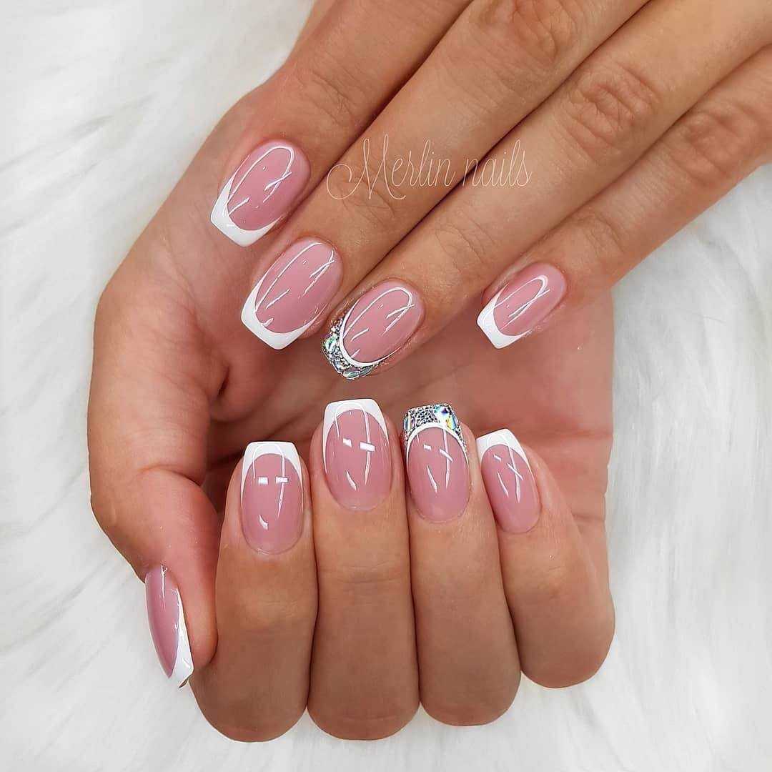 Вместе с французским маникюром можно использовать наклейки, слайдеры или кистью рисовать разные узоры и изображения. Если добавить немного вензелей – получится свадебный френч, а с абстрактным дизайном – повседневный.