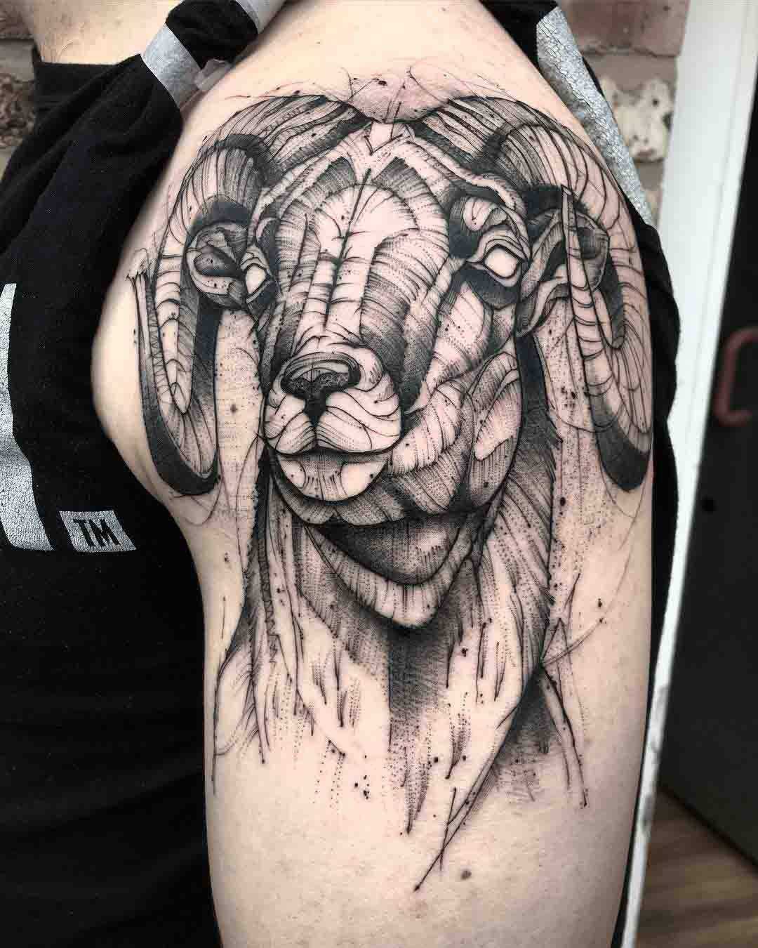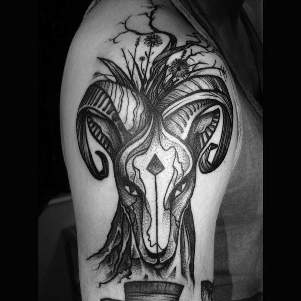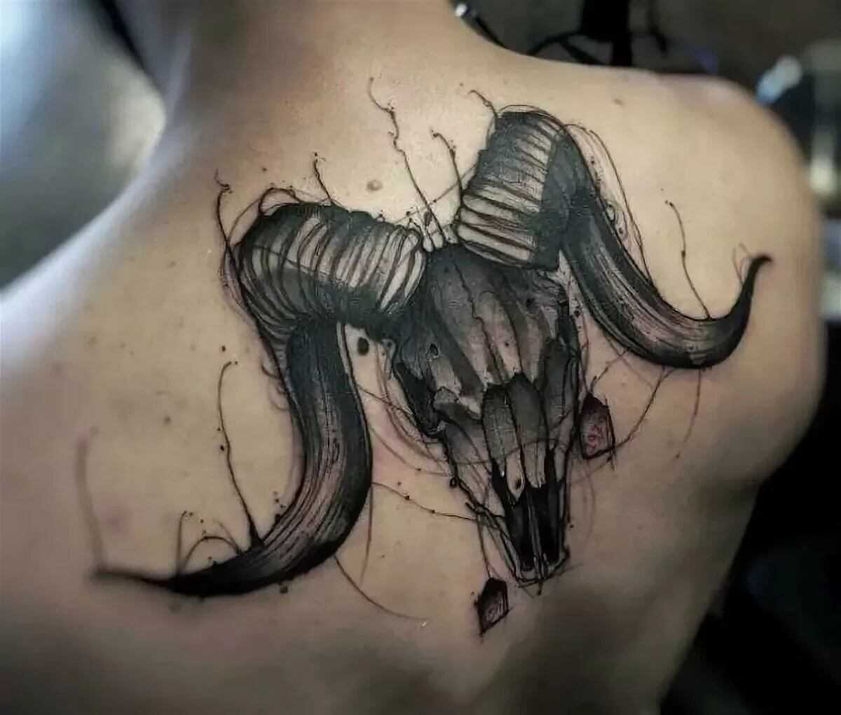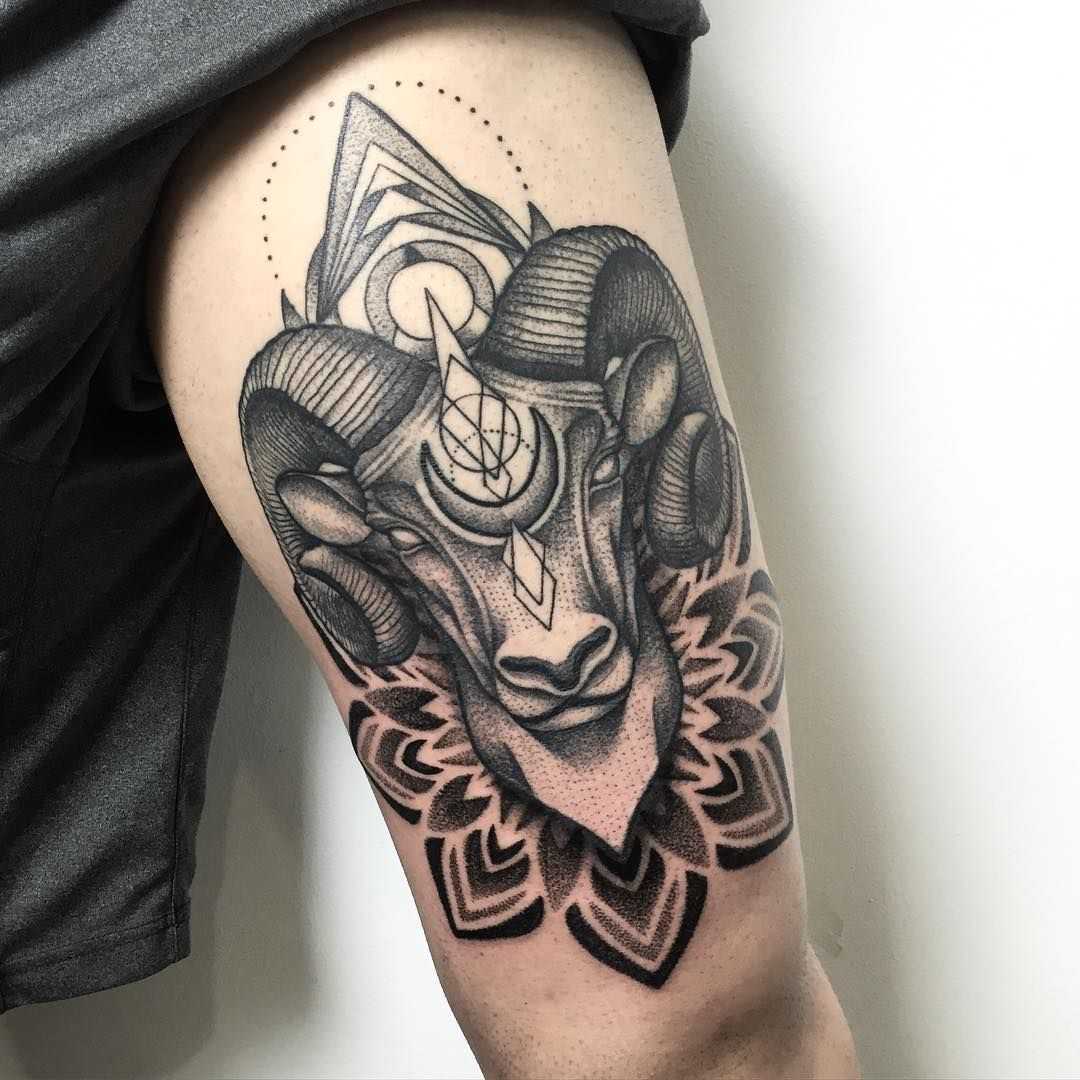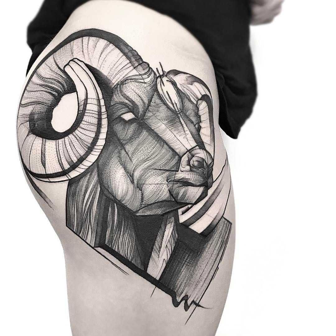 - голова барана – средней сложности эскиз, который гармонично впишется в такие места, как плечи и предплечья, лопатки, бока, бедра;