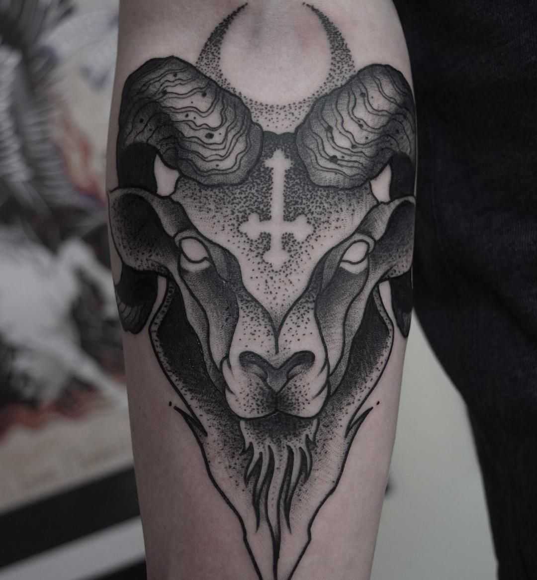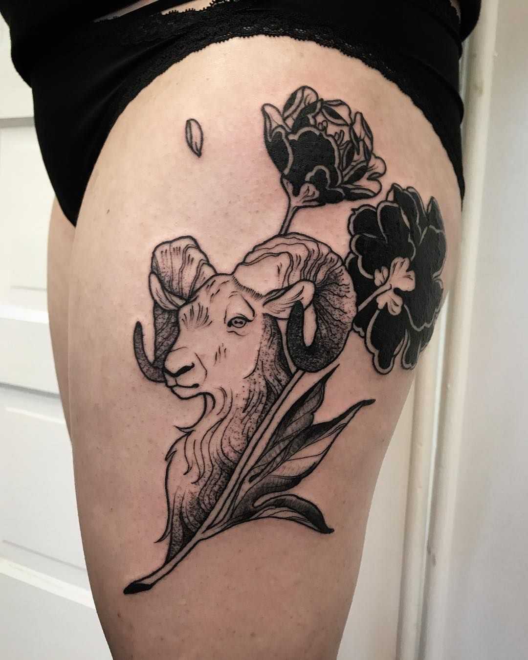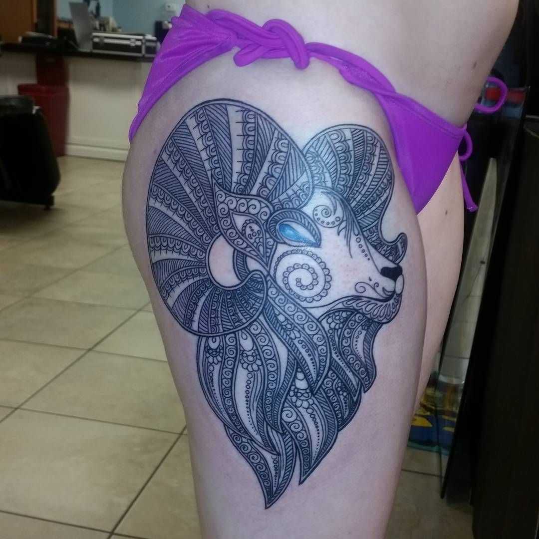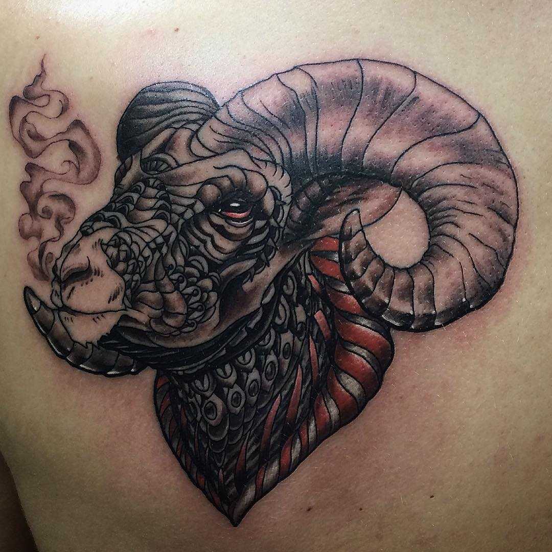 - голова барана – средней сложности эскиз, который гармонично впишется в такие места, как плечи и предплечья, лопатки, бока, бедра;