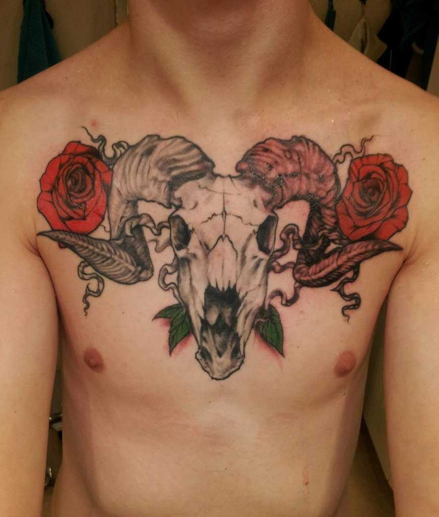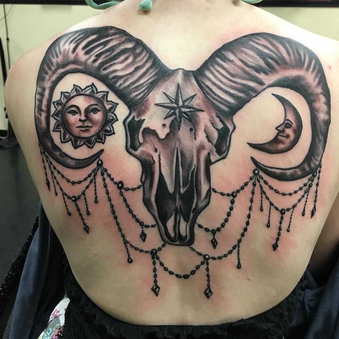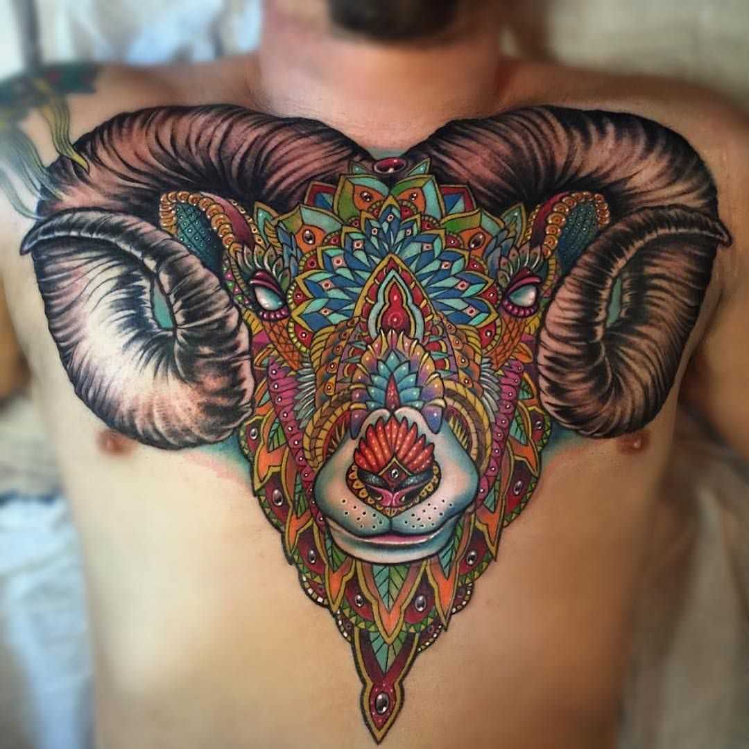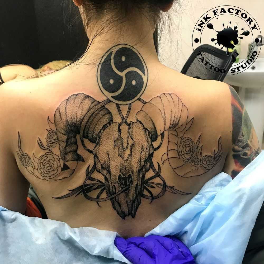 - баран – крупное животное, которое дополняют другими символами и деталями, а значит, композицию наносят на спину, грудь, руки, ноги;
