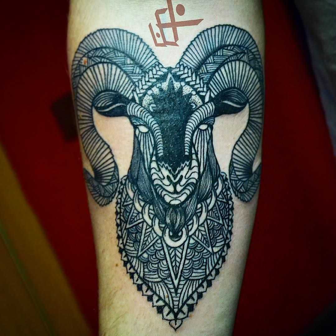 Изображение Овна красиво смотрится как в одиночном изображении, так и совместно с дополнительными символами. Тату Овен стильно смотрится с узорами мехенди, с точечными узорами и символами, с геометрическими формами. Для надписи можно использовать разные шрифты, наиболее востребованный из которых готический.