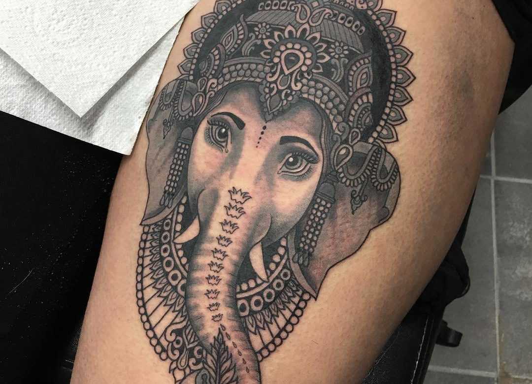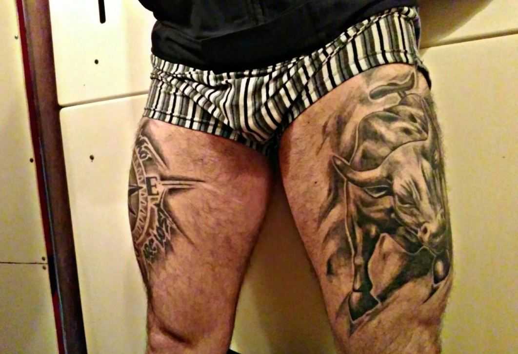 Также активно используют зону бедра, также набивая большие рисунки, составляющие целые сюжеты или же ряд изображений, выполненных в одном стиле. Подобные татуировки могут располагаться как впереди бедра, так и охватывать ногу полностью. Внутренняя часть бедра – достаточно чувствительный участок тела, поэтому нанесение изображения здесь будет болезненным.